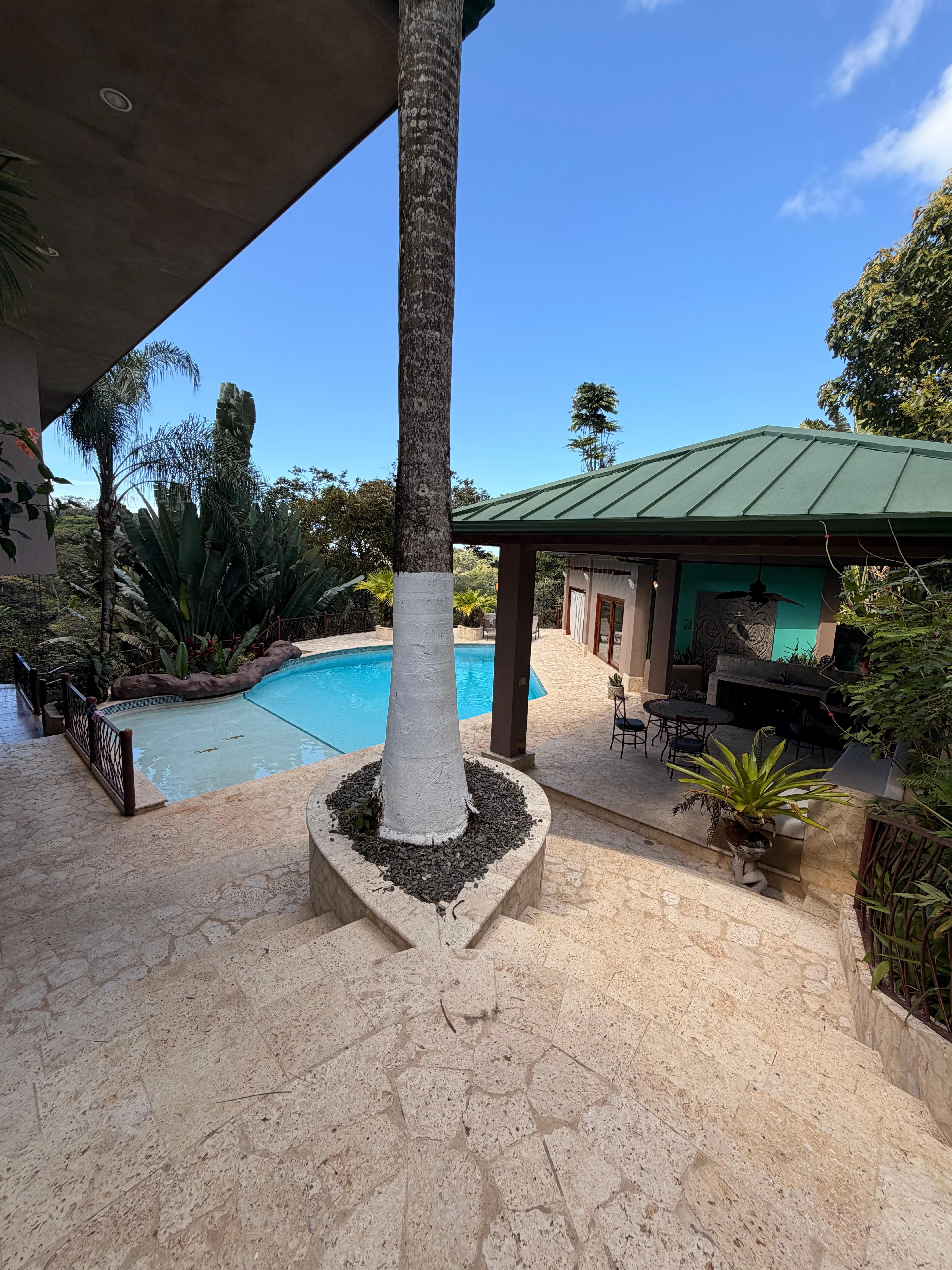 Step outside to the large private pool, complete with a shallow section ideal for kids, and enjoy lazy afternoons under the sun or shaded relaxation in the nearby pool pavilion. This outdoor oasis is perfect for lounging, reading, or sharing a cocktail at sunset while howler monkeys and toucans serenade you from the treetops.