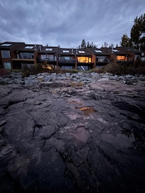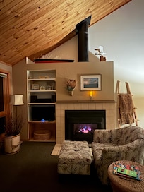 This 2 bedroom with loft offers three sleeping areas. The master loft contains a queen bed and has a wonderful view of the lake and stars from its vaulted ceiling skylights. One private bedroom on the main floor has a queen bed. The loft back bedroom has two twin beds. The full kitchen and living room, with gas fireplace and adjoining dining area, all have a dramatic lake views. The lakeside deck has an electric grill. This Lakehome has two baths. Internet and smart tv. Laundry. Non-smoking. No pets.