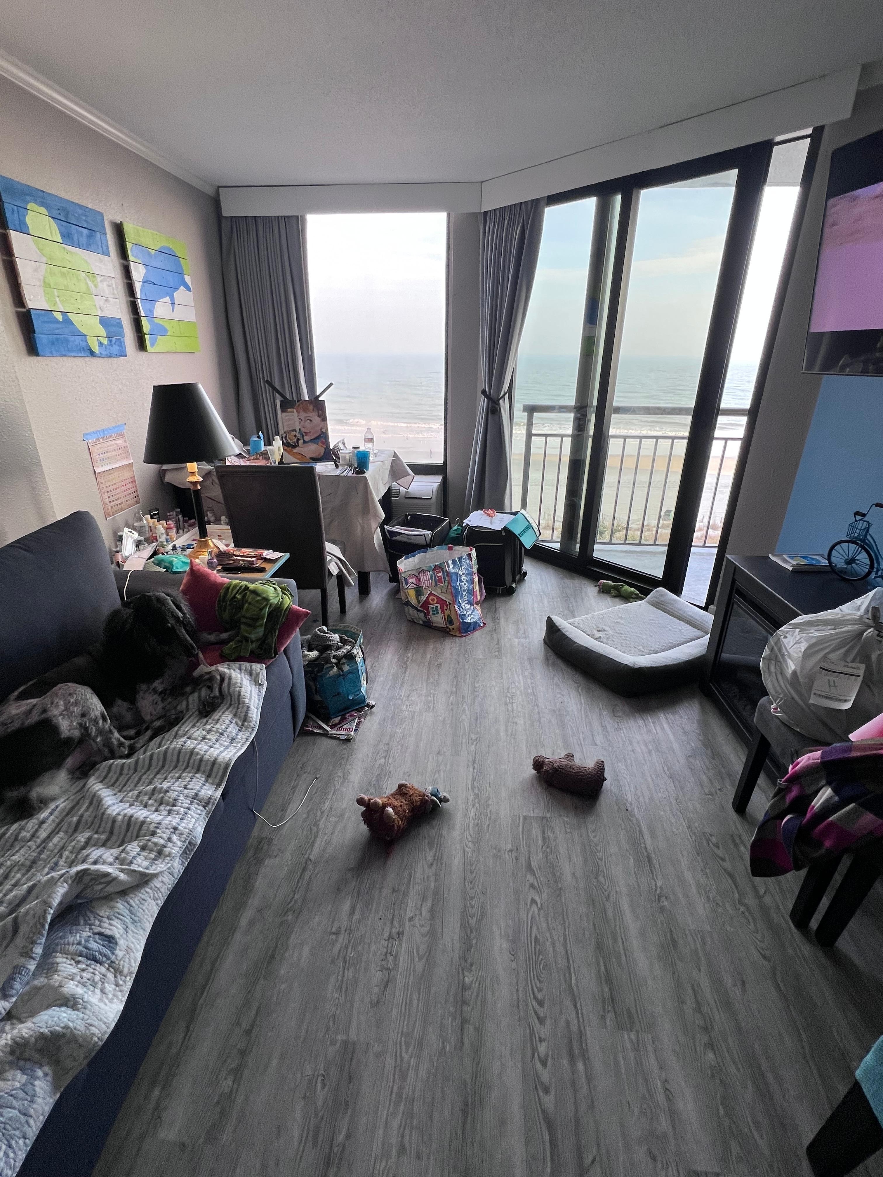 Welcome to OceanAura, a true one bedroom/one bath oceanfront unit with amazing views. Keyless entry with no contact check in or check out. Key code changed after each stay. Luxury vinyl plank flooring, granite counter tops, newer furnishings, 55 inch Samsung QLED SmartTV, bathroom remodeled with new flooring, paint, vanity, light, and gorgeous tiled shower with tub. The bedroom has a king size bed with a very comfy plush mattress to enjoy the views. The nightstands have lamps with USB chargers for your phones and electronics. There is also a tv as well as access to the balcony.