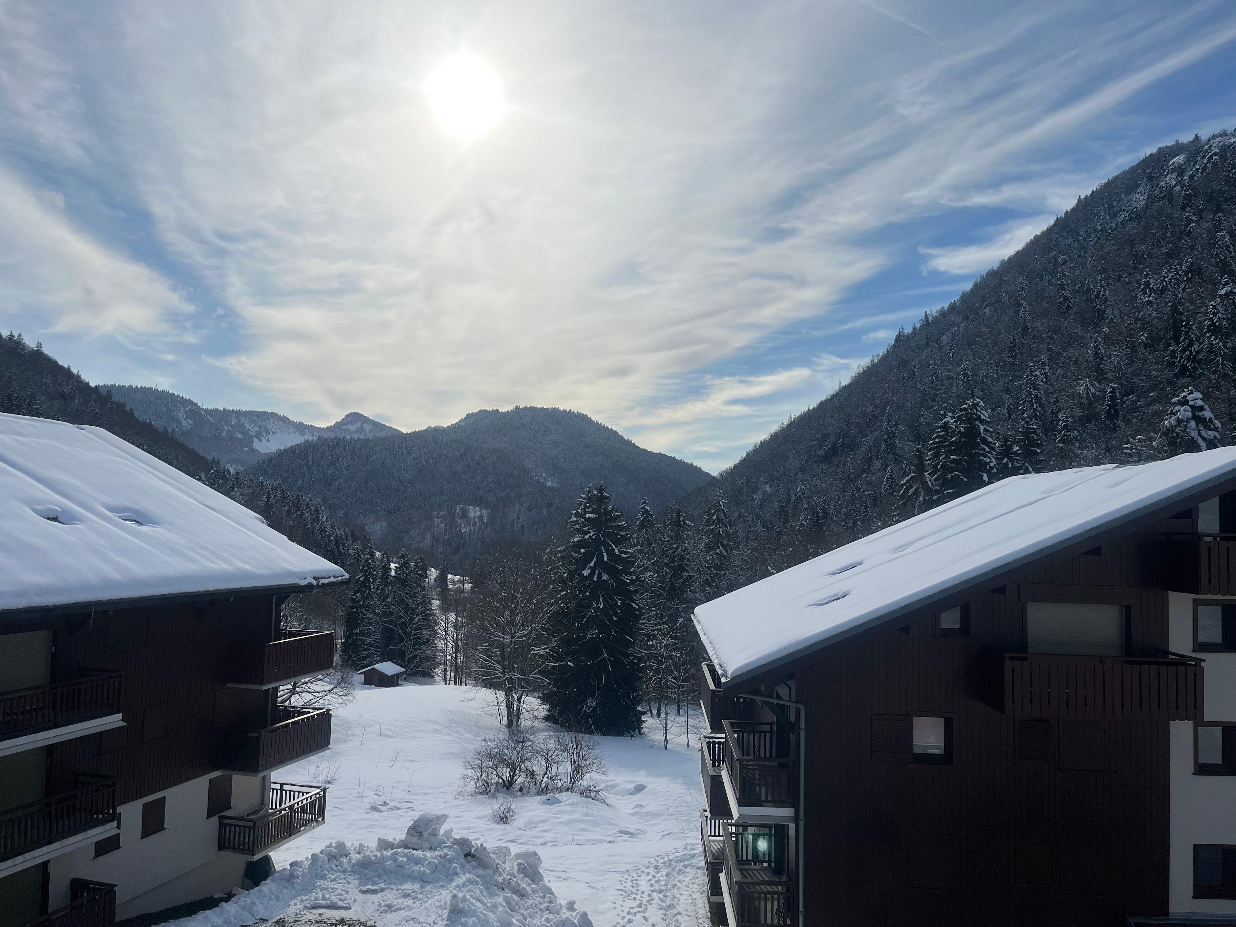 Le studio est orienté plein sud, mais grâce au balcon, le soleil ne rentre pas directement dedans en été, ce qui est plutôt appréciable pour ne pas avoir trop chaud. Il est orienté vers le fond de la vallée, avec une belle vue sur les montagnes environnantes.