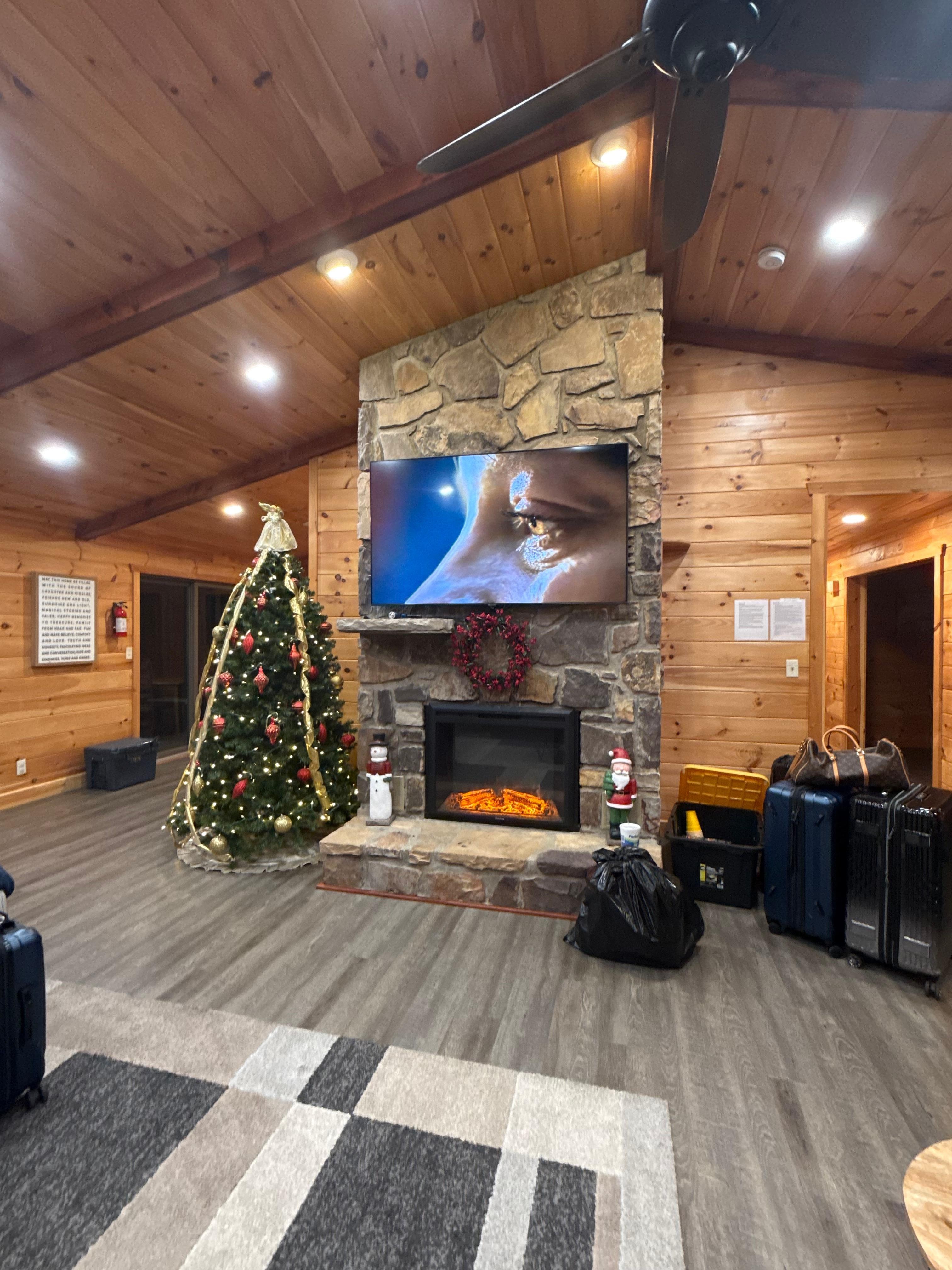 No stairs entry, 2 small steps to front door and full set of stairs to use lower level. Cabin is not handicap friendly. The main level of the cabin is without the use of stairs making it ideal for those who have difficulty with stairs. The main floor of this cabin has a fully equipped kitchen, dining room, 2 bathrooms, 3 bedrooms - master bedroom with 55” smart TV and computer desk/chair, 2 other bedrooms also with 55” smart TV’s. Living room with 70" Smart TV, screened patio and deck.