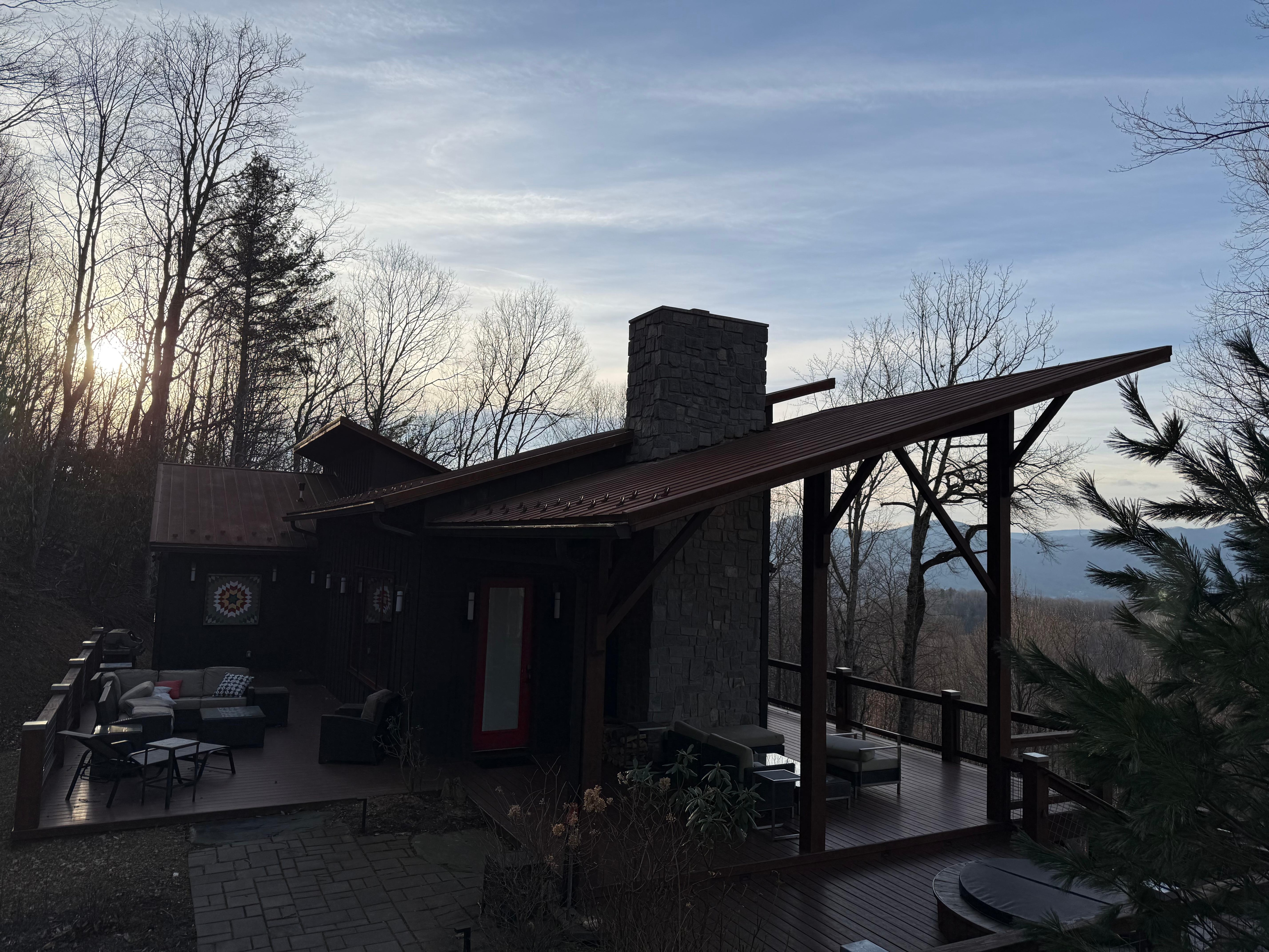 A modern mountain retreat in Ashe County, NC’s amazing High Country. The serene property is nestled in the forest with amazing mountain views. This 1200 Sq ft house sleeps six. One king bedroom, one queen bedroom, and a very comfortable, high-end queen pull out sofa. Bed linens are top quality European fabrics.Two elegant bathrooms are creatively designed to provide privacy for all.