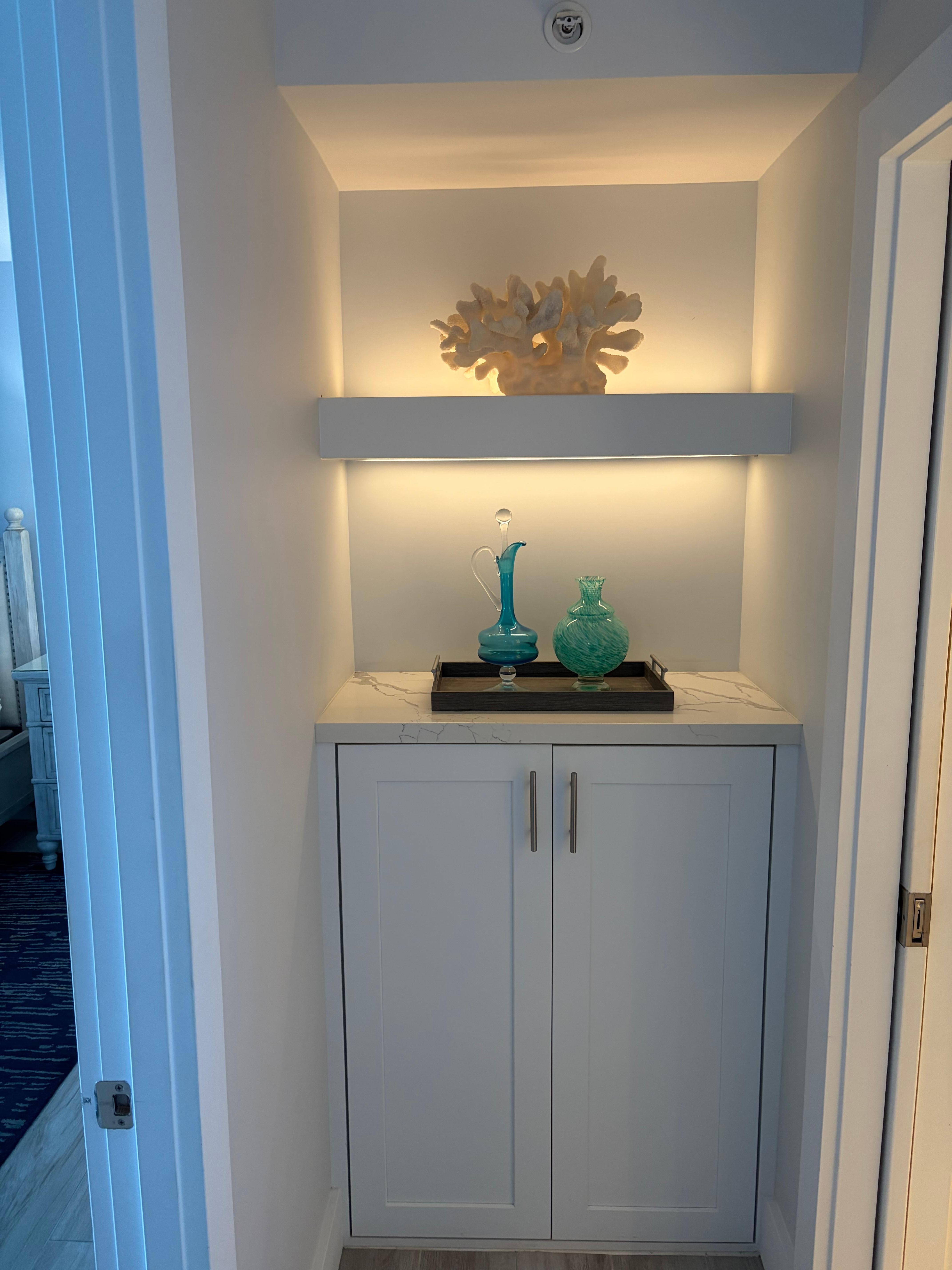 The bathroom contains a large custom shower; a modern, free-form vessel sink; and glamorous beveled, backlit mirrors. Tranquil and lovely. Important from a practical viewpoint, the bathroom also holds your high-end washer/dryer laundry.