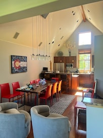 This three-story townhouse offers breathtaking sunset views down the valley floor from numerous windows or from the deck that is equipped with a gas grill and outdoor seating. Delight in watching wildlife in the open space of the valley floor or the seasonal activities like Nordic skiing and snowshoeing in the winter, or paragliders drifting over the open valley in the warmer seasons. The modern living area comprises the entire top floor. The soaring twenty-foot vaulted ceiling and open floor plan lets in an abundance of natural light, and the radiant in-floor heating keeps it cozy. It includes a fully-equipped kitchen that is flanked by a galley with extra storage, a bar area and convenient powder room, a live-edge dining table with 10 chairs, and a warm gas fireplace in front of a plush sectional sofa and velvet swivel chairs in the den area.