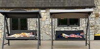 - Large outdoor wooden deck (65'x35') with tanning chairs, lounge chairs and table, gasoline fire pit, and porch swing