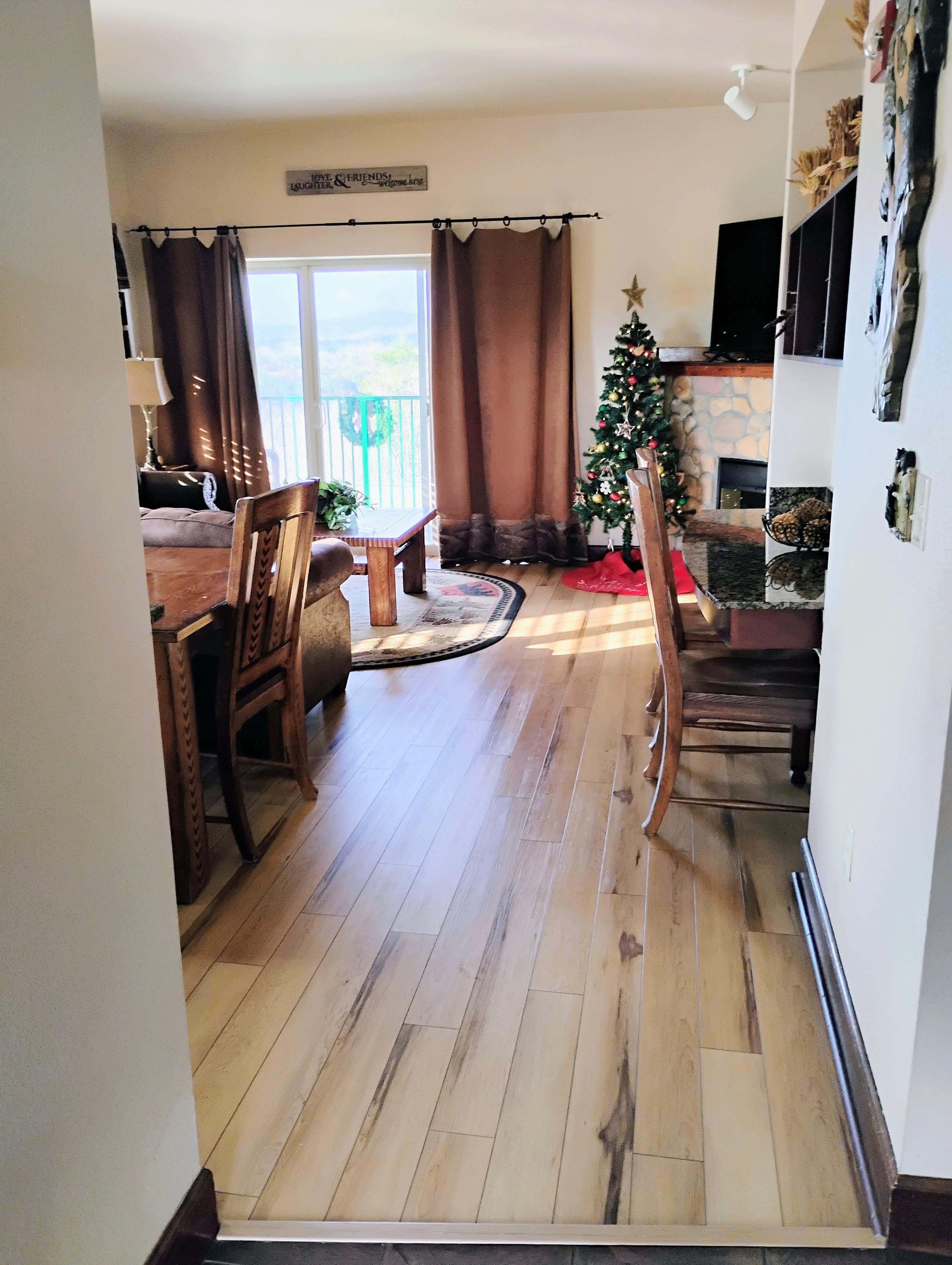 Our vacation rental has several unique qualities. It has a gorgeous panoramic view of the Smokies seen from our wraparound balcony. (One visitor called it a, million dollar view). There are two comfortable rockers on one side of the balcony, and a table and four chairs on the other for outdoor dining.