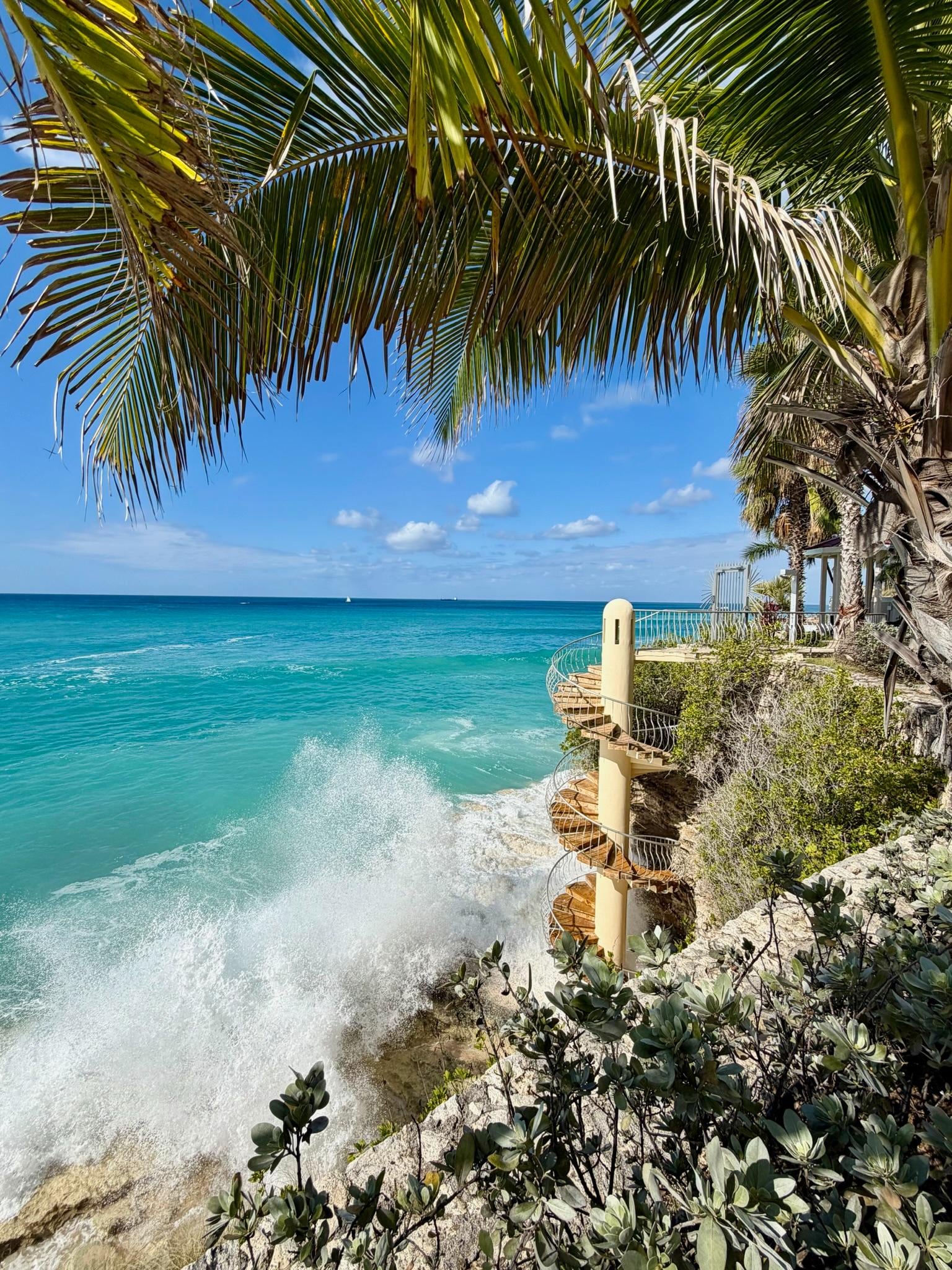 - Spiral staircase leading down to Cupecoy Beach, complete with a secluded cave and inviting waters perfect for swimming, snorkeling, or a romantic sunset beach walk.