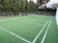 Información sobre la zona de la piscina, la cocina exterior y la pista de tenis: