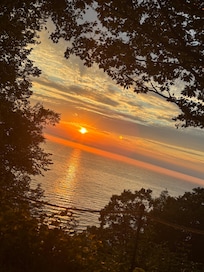 This home is on Lake Michigan with the most gorgeous sunsets right over the water...it's a bonus when you see a storm rolling over the water. Although the home is quite modernized, it's also the quietest, most peaceful place we know with very little activity near it. Many beaches are nearby with plenty of good food and shopping, but you'll get every bit of the relaxation you need when you walk through the door at Inn Dew Thyme. There's lots of nice perks here also such as beach chairs, firewood, fast (fiber) wi-fi, and much, much more.