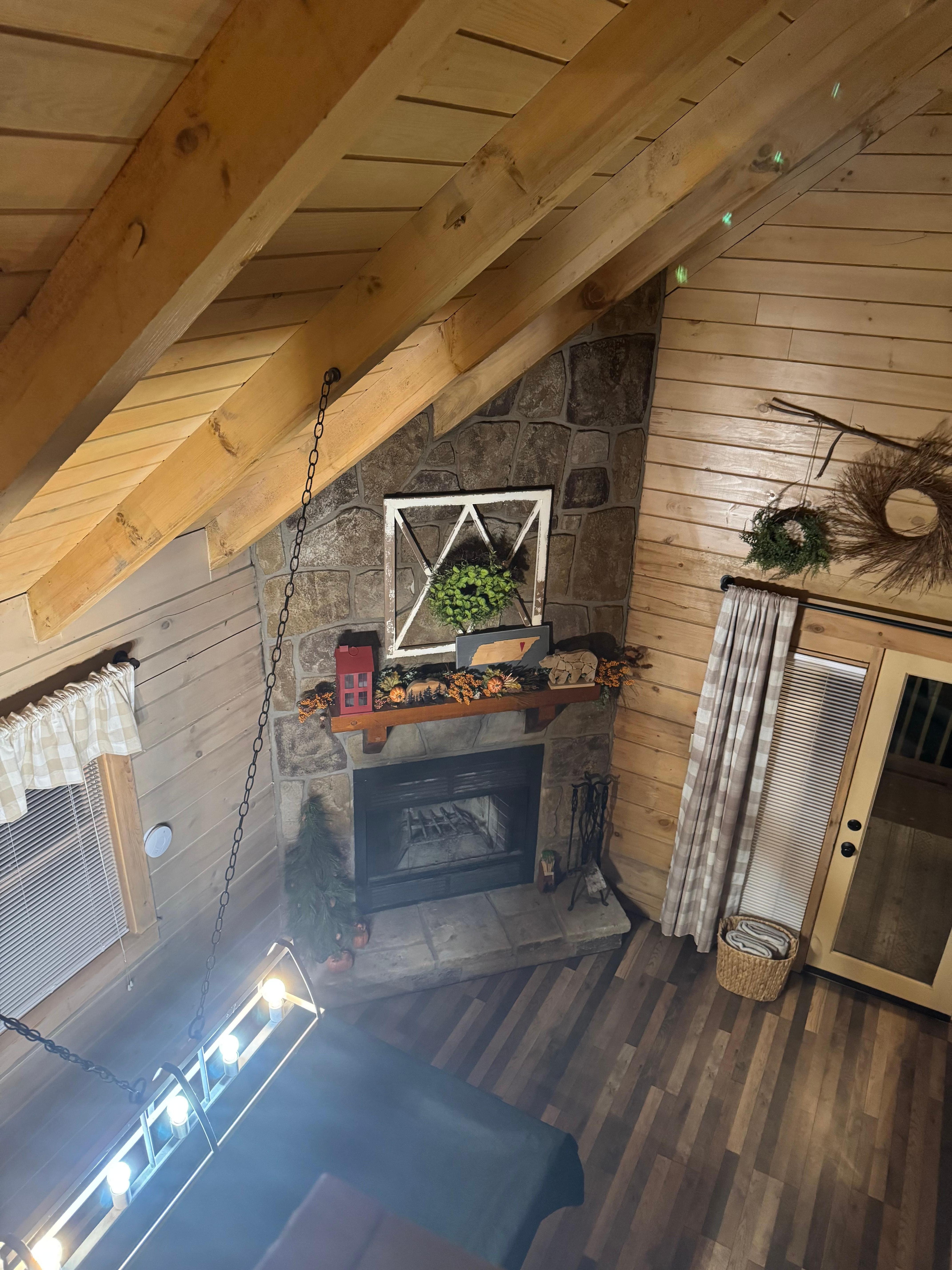 The cabin is very secluded and private, with lots of trees that surround the property. There is one Blink Camera installed at the entrance/driveway for your protection and ours. It also has a mountain view, not as great when leaves are out.. Private deck with large hot tub, pool table, wood burning fireplace, firewood provided in Winter months, big screen TV with cable and Roku, unique Bubbler Jukebox (decoration only, however the bubbler does function) Vizio sound bar added for music located on TV Stand, fully furnished kitchen and very romantic open loft master bedroom with king bed. Best of all it has a red heart shaped Jacuzzi that sits under a skylight and when you look up, you can see the stars and moon on a clear night.