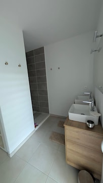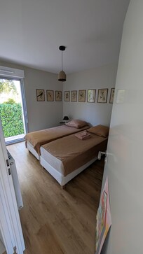 The first bedroom has a 160 x 200 cm bed, a large built-in closet with shelves and wardrobes. The second consists of two beds of 80 x 200 cm to be pushed together or not according to need and a small wardrobe. New bedding. The bathroom is equipped with a walk-in shower and two sinks.