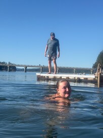 As the water warms in summer, take a swim out to the swim deck. It’s so refreshing! Utilize the outdoor shower to rinse off that sand and salt water.