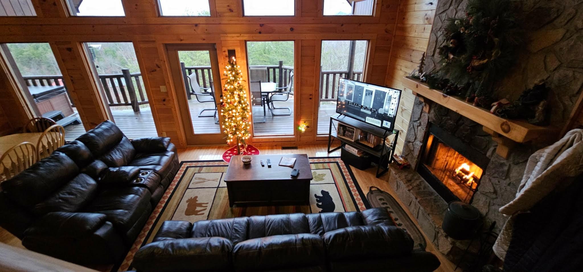 The first floor is an entertainment and sleeping area. You’ll love the comfortable hang out areas, the queen bed nook, views from the floor to ceiling windows and your own wrap around deck with a seating area.