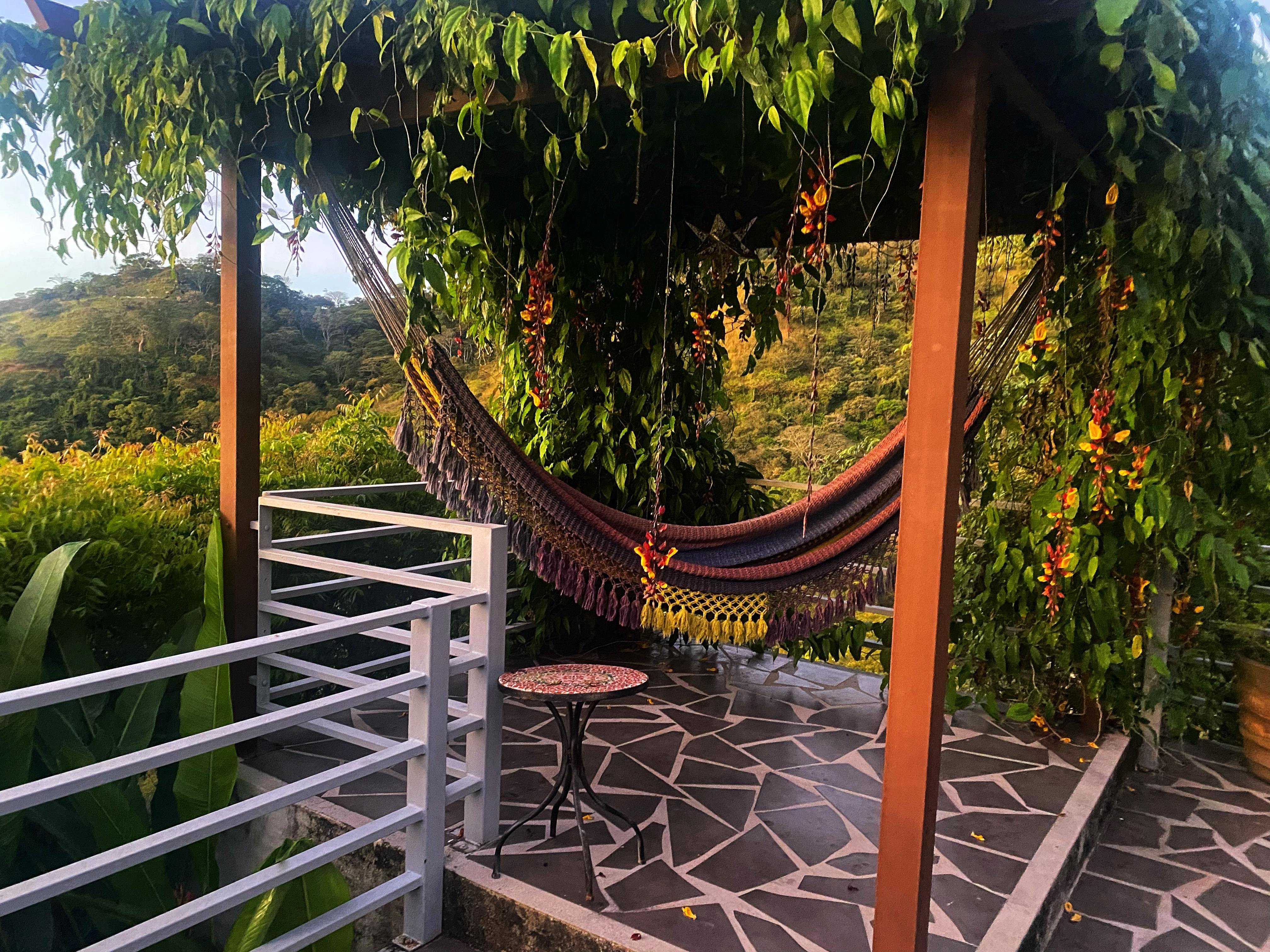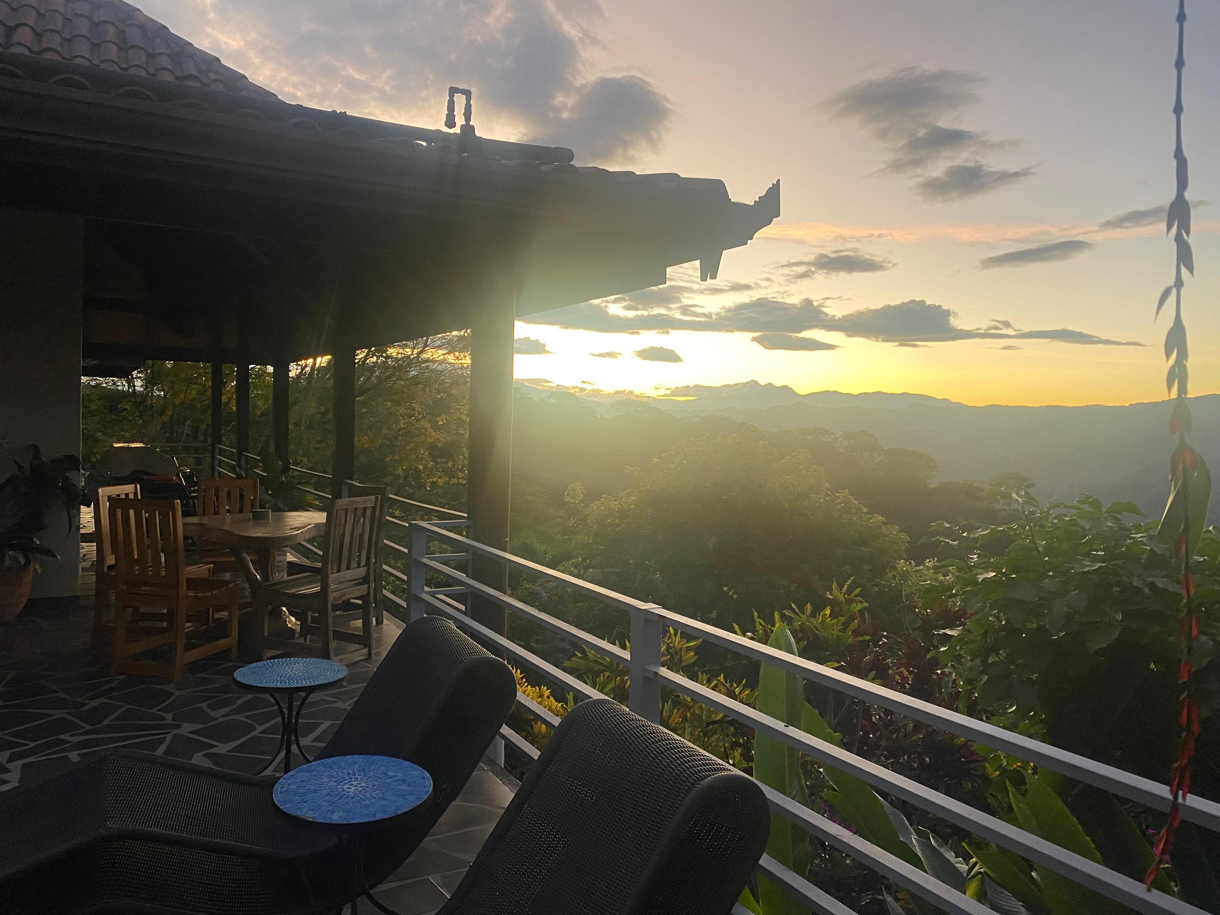 El mejor de todos los mundos posibles: nuestro nuevo hogar La Luna Vista realmente tiene todas las comodidades modernas, pero está rodeado de naturaleza. El gobierno costarricense ha elegido preservar nuestro hermoso valle debido a su gran belleza natural. Solo ves árboles y montañas desde la terraza que rodea la casa sin importar dónde mires. Por la noche, la naturaleza ofrece un espectáculo de luces en los cielos despejados, y a veces se puede ver la danza del rayo sobre las montañas más allá del valle. Hay total privacidad pero, por otro lado, hay vecinos cerca. Nuestro pequeño pueblo de Atenas tiene maravillosos restaurantes, muchos supermercados con vinos chilenos y argentinos, incluso entrega de pizzas y modernas necesidades de cocina estadounidense. Un mercado de agricultores donde todos los agricultores de los alrededores traen deliciosos mangos, verduras, frutas coloridas y especialidades locales todos los viernes en el parque.