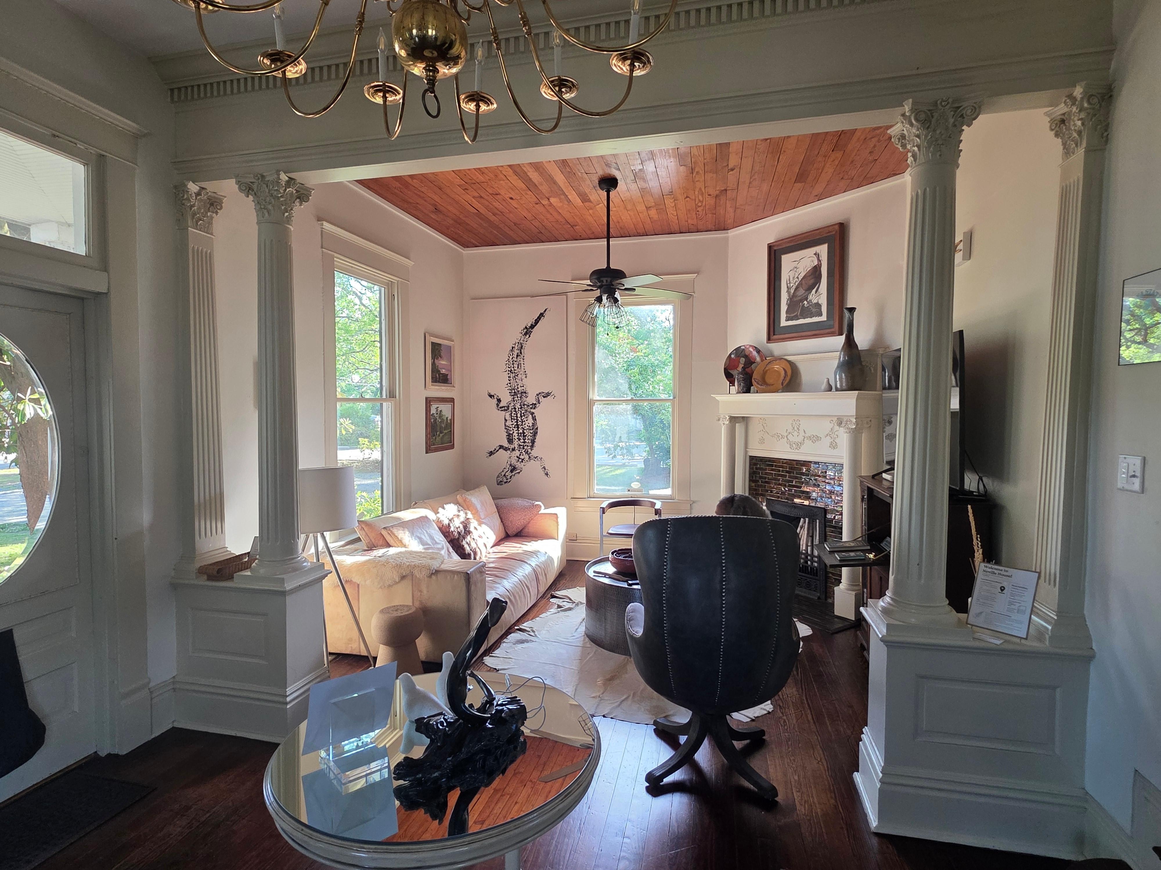 As a Northeast Louisiana native, I've been in love with Neville House and the story behind it since I was a little girl when my mom would take me on day trips to explore the [Monroe] Garden District. NH is a true example of Southern beauty with its white washed clap board cypress siding and double porches beckoning you to come and stay for a while. NH is a two-story neoclassical home featuring historic architectural details (original 120+ year old hardwood floors and windows throughout!). It is lovingly decorated with an eclectic mix of antique and modern furniture & furnishings designed to provide guests with an artistic emergence in the local culture. The interior is full of curated original works of art & antiquities from local & regional artists & makers designed to provide an unforgettable experience. Up to 4 people can stay in this exceptional "art gallery" centrally located in the Monroe Garden District (corner of Hudson Lane & 3rd St.). You will enjoy a NH welcome box (full of local goodies) and modern comforts (Wi-Fi, TV, equipped kitchen) while being immersed in a unique place.