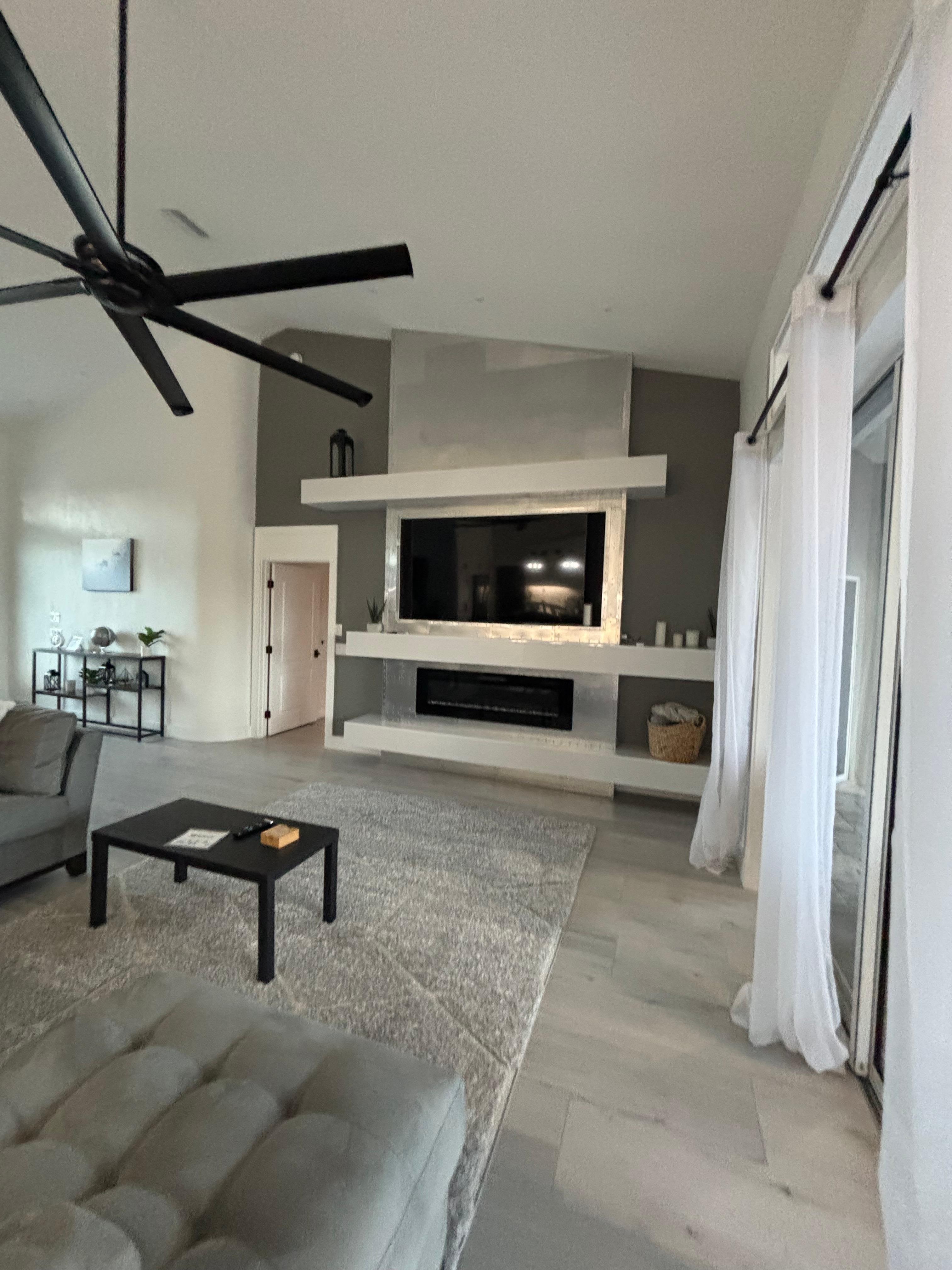 >Two living/gathering areas with fully opening sliding glass doors that allow for a full view of the outdoors. Huge 96” ceiling fans with LED lighting and remotes.
