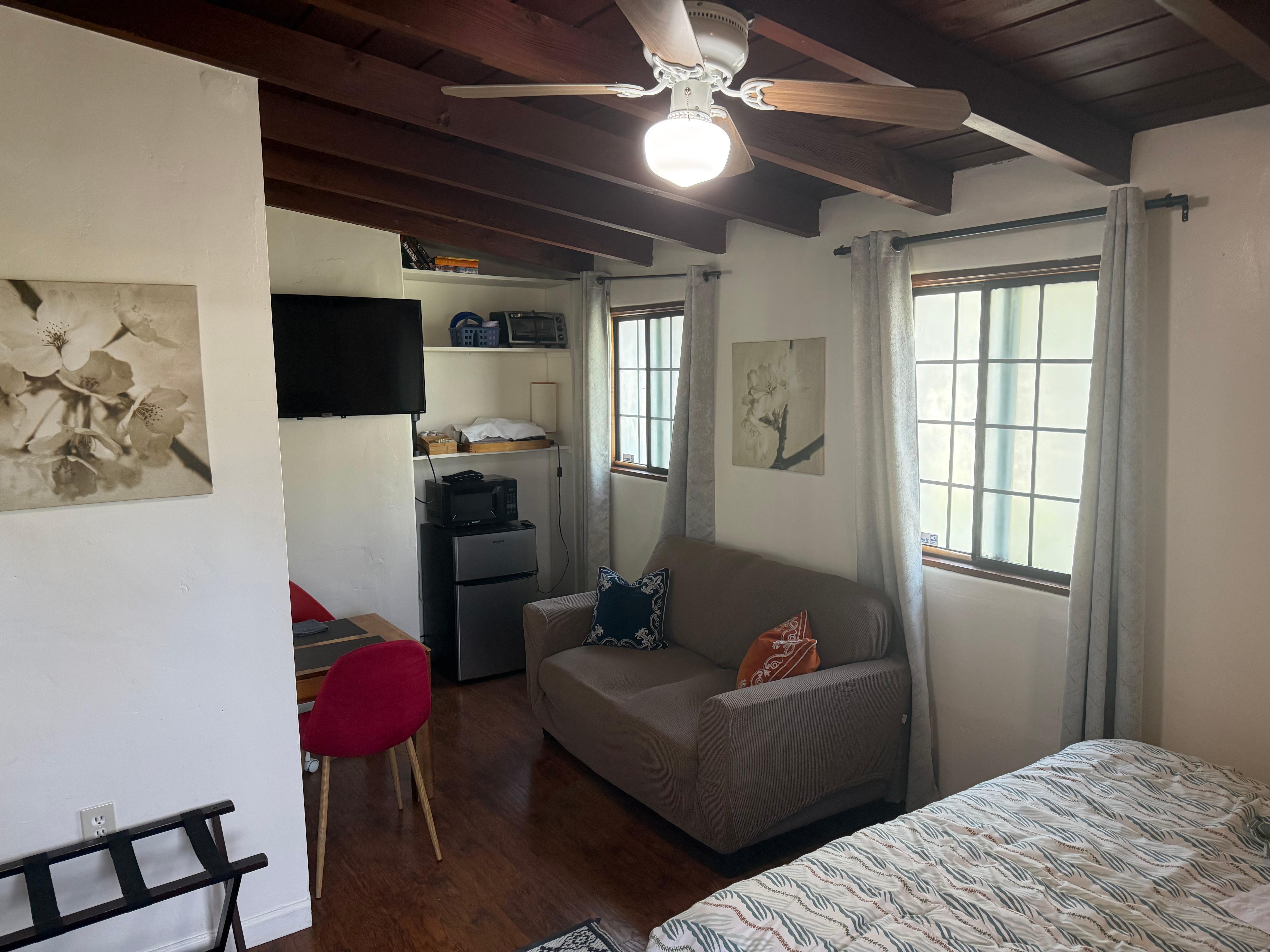 A private and comfortable Palm Springs getaway - accommodating up to two guests. The property is dotted with bougainvilleas and blooming plumerias and features an outdoor pool at our sister property next door. Room features a comfortable Queen size bed, a sofa, a TV, fridge, microwave, coffee maker, plates, cups, glasses, utensils and Free WIFI.