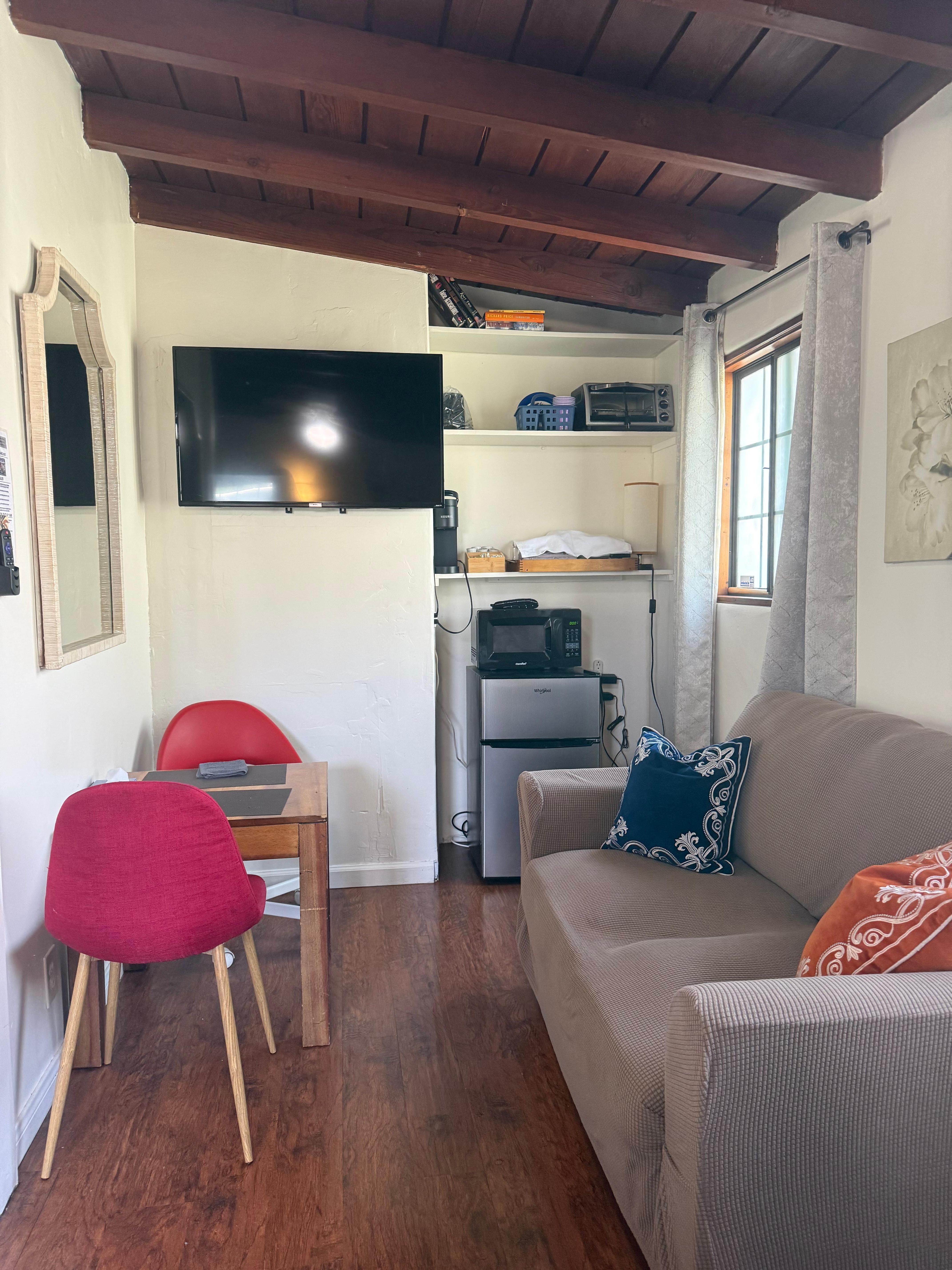 Great little place. But could use more hooks in the bathroom and a better coffee pot. Bed good. Tv ok. Shower wonderful. LOVED the location! Cole very nice to deal with!!