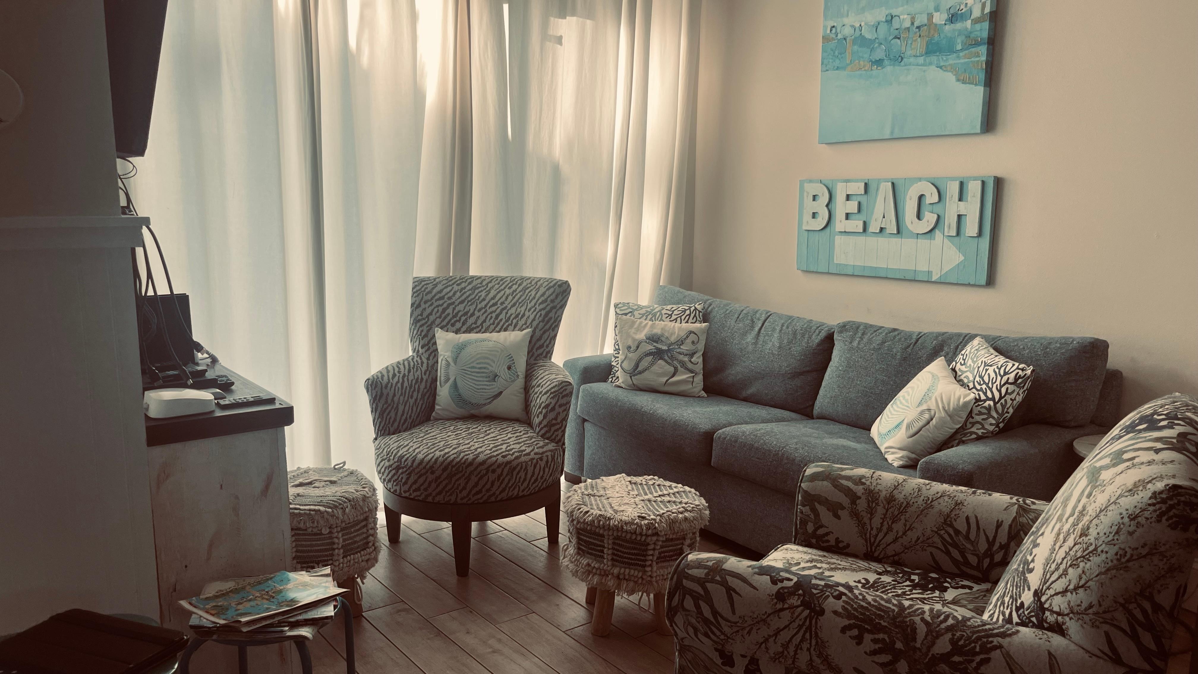 Step inside this cheerful coastal retreat and enjoy a bright, open floor plan filled with natural light and tropical decor. The kitchen features stainless steel appliances, utility essentials, and island seating, perfect for island-inspired meals or casual conversations. The living area, with a plush sofa and a large TV, is ideal for relaxing after a fun day at the beach or gathering with friends around the indoor dining table.