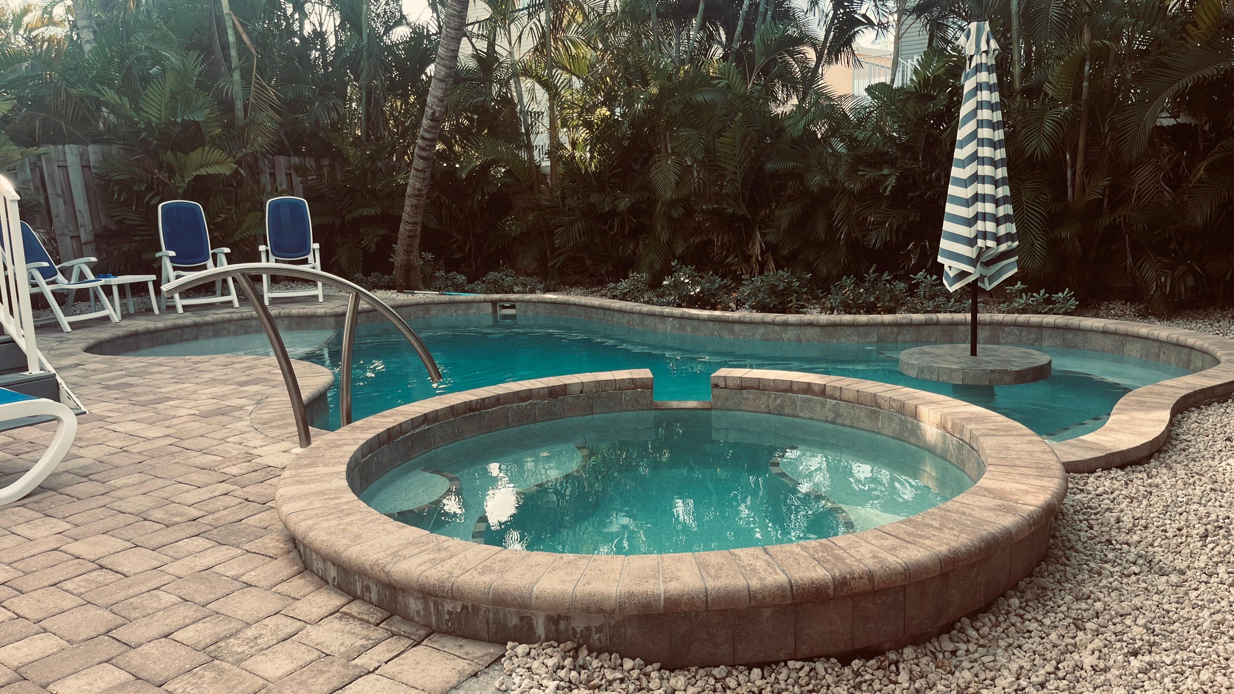 • Private pool with sun shelf, hot tub, and built-in tiki bar