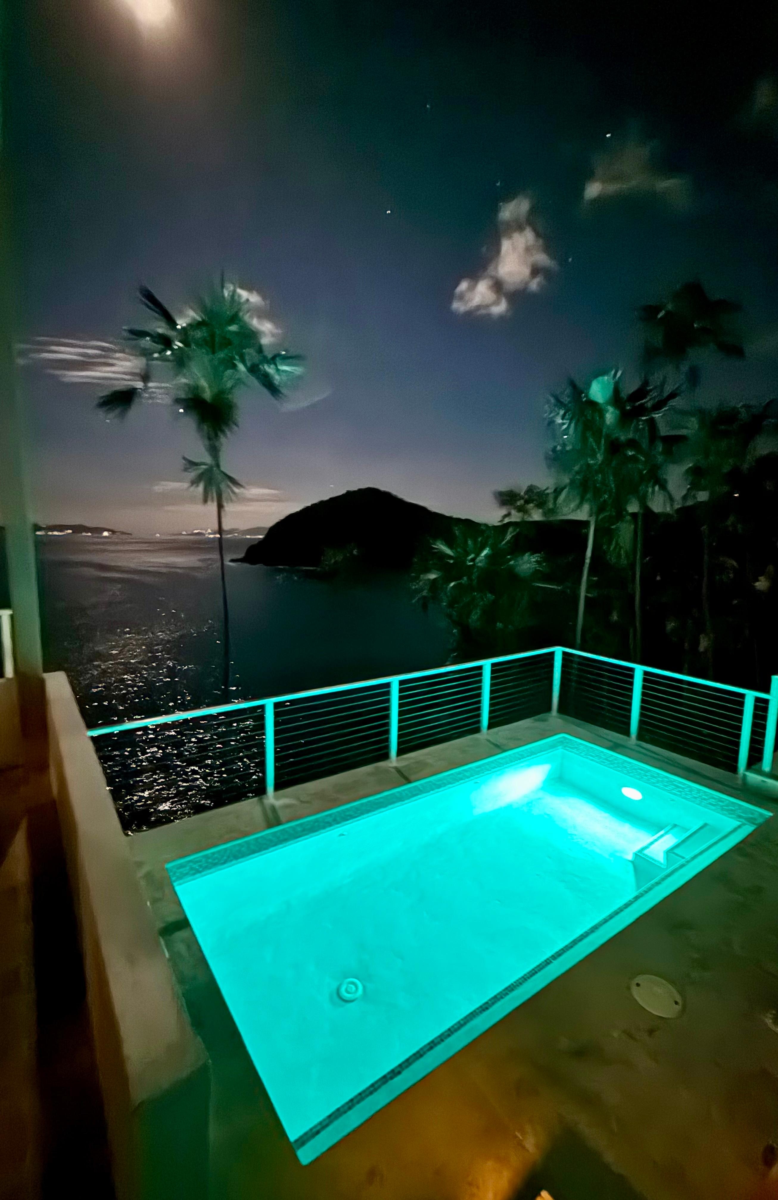Gorgeous Caribbean paradise with 3 private bedrooms w/ ensuite bathrooms all luxuriously appointed and fully remodeled. Sprawling living and kitchen layout perfect for larger groups to get together and enjoy stunning ocean views with direct line of site over to White Bay in the BVI, Tortola, Hans Lollik and Mandahl Beach/Salt Pond. The villa is equipped with multiple patio areas that allow the trade-winds to blow through the property for comfortable outdoor living. Huge Pergola covering the main outdoor living space with outdoor dining table/chairs. Look directly out at the turquoise Caribbean water with multi-million dollar views through the palm trees and down at crashing waves and sailboats passing by. Grab our binoculars and view whales migrating during the winter months. Step into the pool equipped with color changing LED light and relax all day with a drink and a good book. The pool gets excellent morning sun keeping it warm throughout the day. Built in ledge allowing for sunbathing or reading/relaxing. Step up to the upper deck and enjoy the lounge chairs and let the stress melt away. House is fully stocked with everything you'll need for your stay including beach chairs, snorkel gear, beach bags, beach towels, regular high quality towels, linens, extra pillows, soaps/shampoo's and bathroom essentials. Kitchen is fully equipped w/ everything you'd expect including small appliances ( toaster, griddle, coffee maker, keurig w/ k cups, blender) pots/pans/bowls, cups, glasses, coffee mugs, cutlery, baking pans/sheets and a gourmet commercial gas range/oven. High Speed Internet/WIFI provided & SMART-TV's in each room with SLING cable service & equipped with Netflix, Amazon Prime, Hulu and more. House is equipped with Solar Panels and Tesla Battery Back Up system to maintain electrical service during any outages that could occur. High end 5 stage water purification onsite with Ultra Violet & reverse osmosis filtering. The Villa is gorgeously landscaped with flowering plants, palms, fruit trees, and tropical underbrush. Home is very private with no line of site views from any other homes for a truly secluded feel. Driveway is well lit with photo-eye lighted path and motion sensing LED lights at entrances. 7-10 minute drive to Magens Bay Beach which is one of the top 10 beaches in the world. 3 minute drive to Mandahl beach and Salt Pond which is like a natural pool the whole family will enjoy. Just a few minutes from shopping/dining and a great central location for touring the island. Be sure to rent a vehicle when you stay at any villa in St Thomas. If this property is booked or you have a larger group, we own and manage another gorgeous villa overlooking Magens Bay Beach w/ private pool. Check out our direct site at RNRVACAYS.COM. Come and be our guest at Good Vibes Only Caribbean Villa!