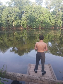 Serene waterfront Log cabin home close to Gettysburg Kayak, fishing and deck