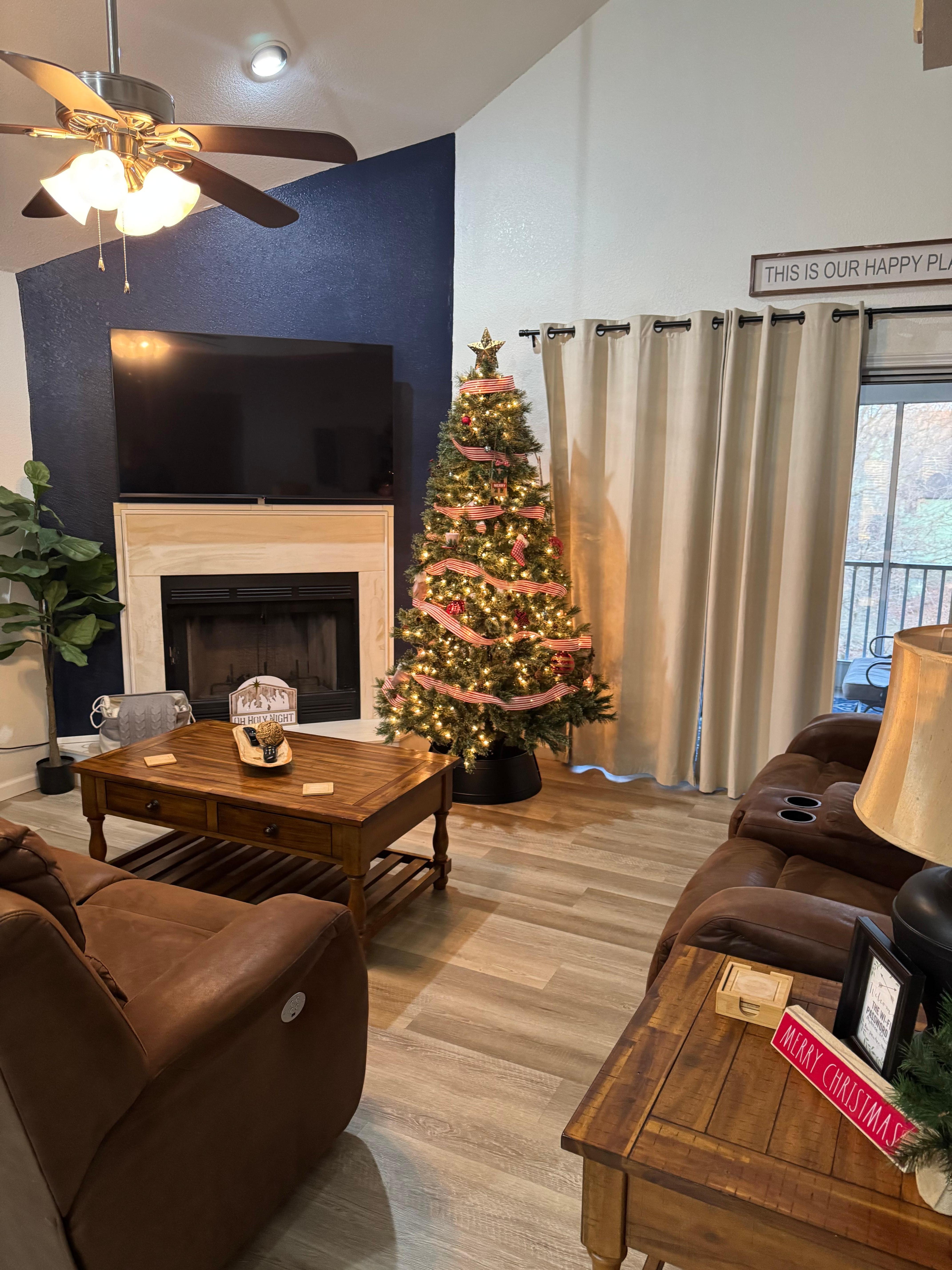The living room features 2 large sofas with power recliners to relax in while watching the SMART TV.