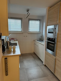 1 cocina con muebles de cocina totalmente equipada para un máximo de 4 personas. Cubertería, vajilla, placa de inducción, campana extractora, lavavajillas, fregadero, horno, heladera con freezer, microondas incl. Parrilla, máquina de café completamente automático, máquina de café de filtro, calentador de agua, cocina de huevo. Una selección de especias básica está disponible para ellos.