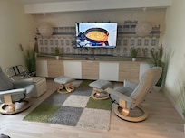 1 sofá del salón con un somier y dos divanes y armarios. TV por cable 4K de 55 "con Internet y la aplicación de Netflix.