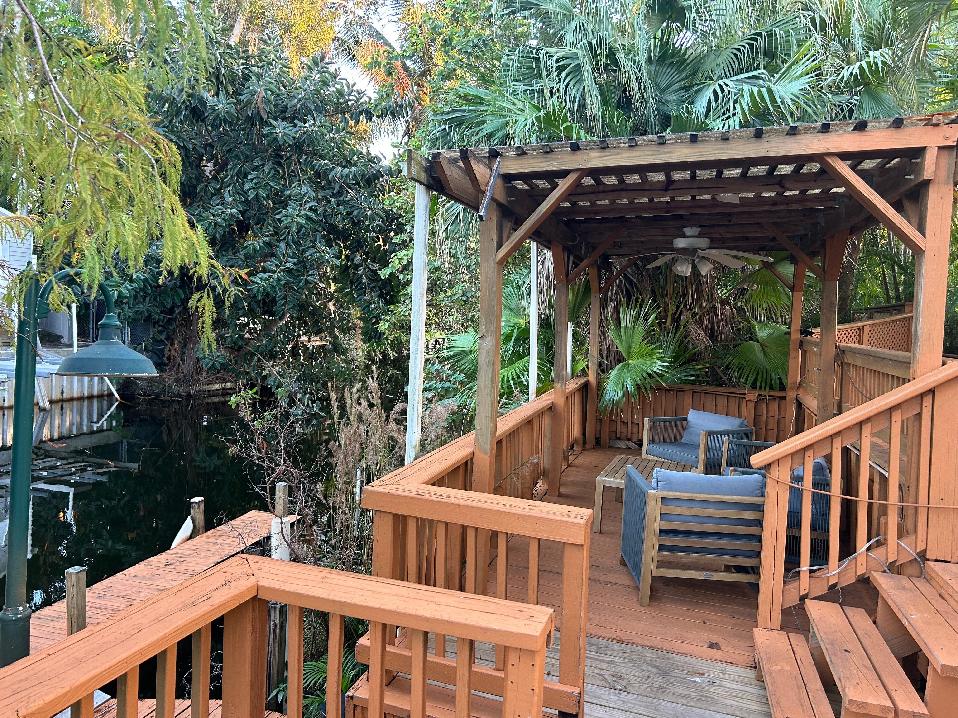 Outside behind the pool, you'll find a unique wooden swing gazebo, or head over to the deck to enjoy an evening by the river.