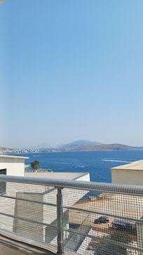 un dormitorio y una sala de estar con una cocina adyacente. Tanto las habitaciones tienen una hermosa vista del mar. El balcón en la sala de estar tiene una vista frontal del mar y el balcón El dormitorio tiene una vista lateral al mar.
