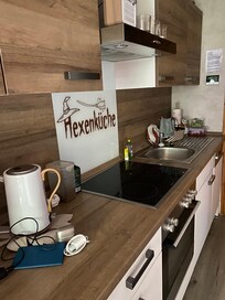 ¡Una nueva cocina con estufa, horno, lavavajillas, cafetera, tostadora, hervidor de agua, licuadora, moldes para hornear, etc.!