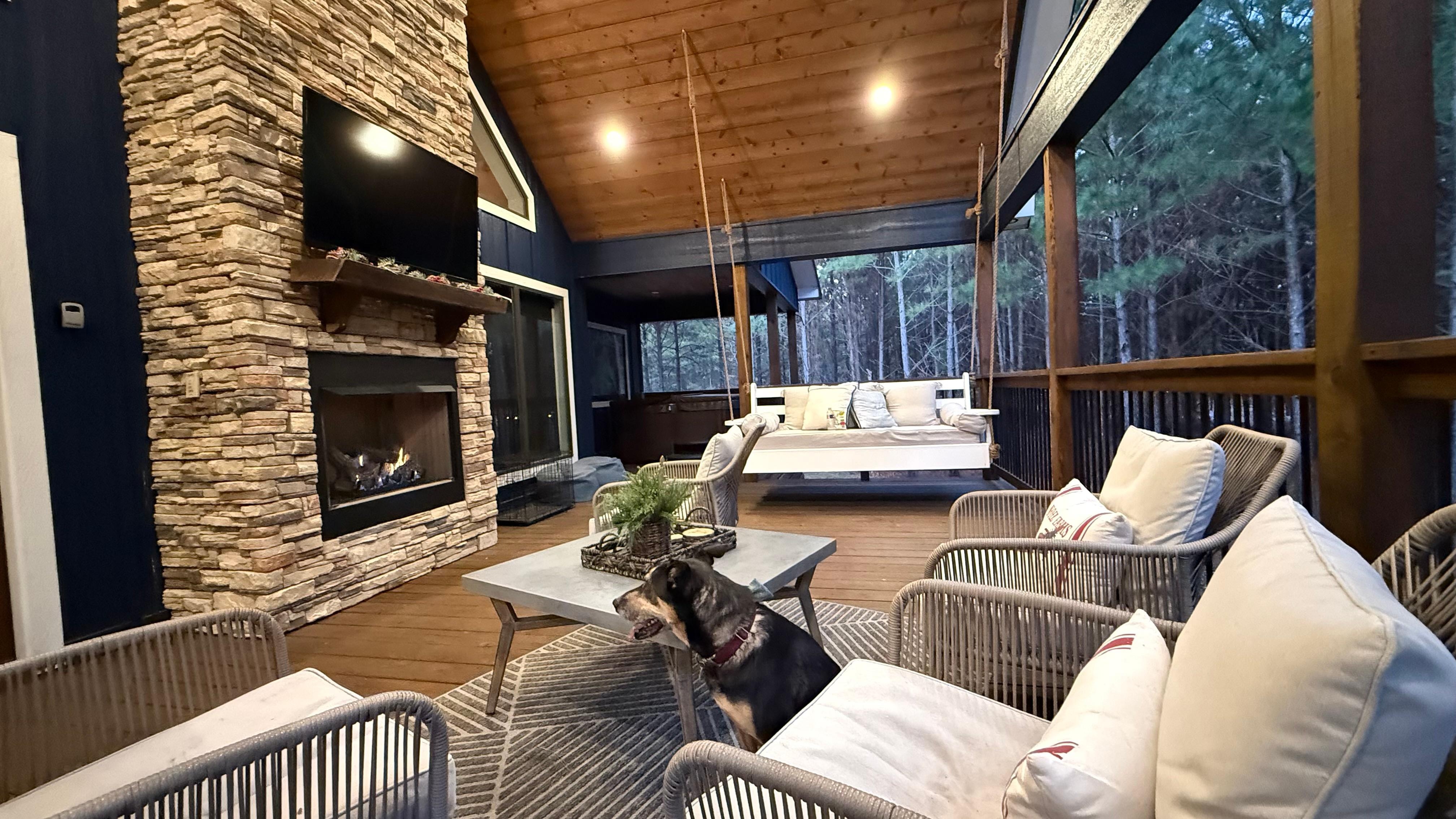 We provide all the amenities to make your stay a home away from home experience. Thoughtfully designed, stocked, and decorated to create a cozy, family-friendly space with entertainment both indoors and outdoors. An amazing back porch to entertain or relax and enjoy the peaceful surroundings. A favorite is the oversized porch swing bed, perfect to enjoy a book, nap, or catch up on your favorite tv series.