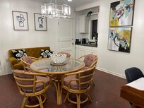 The dining area features a wet bar with a Keurig coffee and tea station, bar height dining table with bar chairs, and nice artwork. There is a small couch here for extra seating. There is a desk with ample writing materials and a charging station. New recessed lighting and small window (to view the outdoor aviary filled with birds) added September 2024.