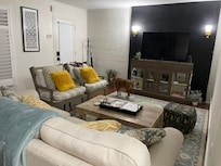 Upon keyless entry, you will notice how well appointed and bright the home is. The new queen sofa bed has been upgraded with a memory foam mattress. There are also two large cozy sitting chairs with tons of pillows and a throw blanket to curl up with. Feel free to kick back and watch a movie on the new 55" smart TV equipped with Amazon, Netflix, Hulu and Disney +. There are games to enjoy in the media cabinet. You will also find a record player with a selection of records to choose from. There is a desk with writing materials, guest book, and charging station for multiple devices. New recessed lighting added to den in September 2024.