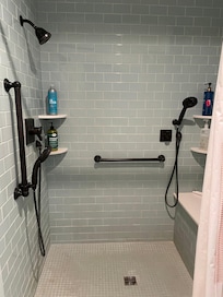 The apartment was renovated a few years ago, and the bathroom is the best part. The bathroom is extremely well designed, and you truly feel like you are in a hotel or spa. The floors are HEATED! The sink and spacious shower are wheelchair accessible and equipped with support bars. The large shower has 2 sets of sprayer nozzles and a large seat. There is no tub. There is a baby bath available to use in or out of the shower. There is a robe for your use. There is a large walk-in closet off the bathroom where extra sheets, towels, soaps, portable baby crib & memory foam mattress, baby bed sheets, toilet paper, laundry hamper, hangers, ironing board, and iron are kept.