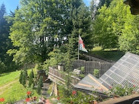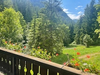 Apartamento 4 en el 1er Piso. Vista desde el gran balcón de la esquina hacia el sur y el oeste, hacia el valle hacia el arroyo y el prado al sol del mediodía y la tarde