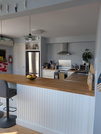 The accommodation benefits from a walk in shower, full kitchen with dishwasher and open concept kitchen, lounge and dining room with a breakfast bar and wine cooler/ It offers ocean views from every room, Heat pumps and Air conditioning make the accommodation cozy or cool depending on the seasons requirements and guests can enjoy a Woodburning stove for a cozy night in whilst relaxing. watching the views or TV