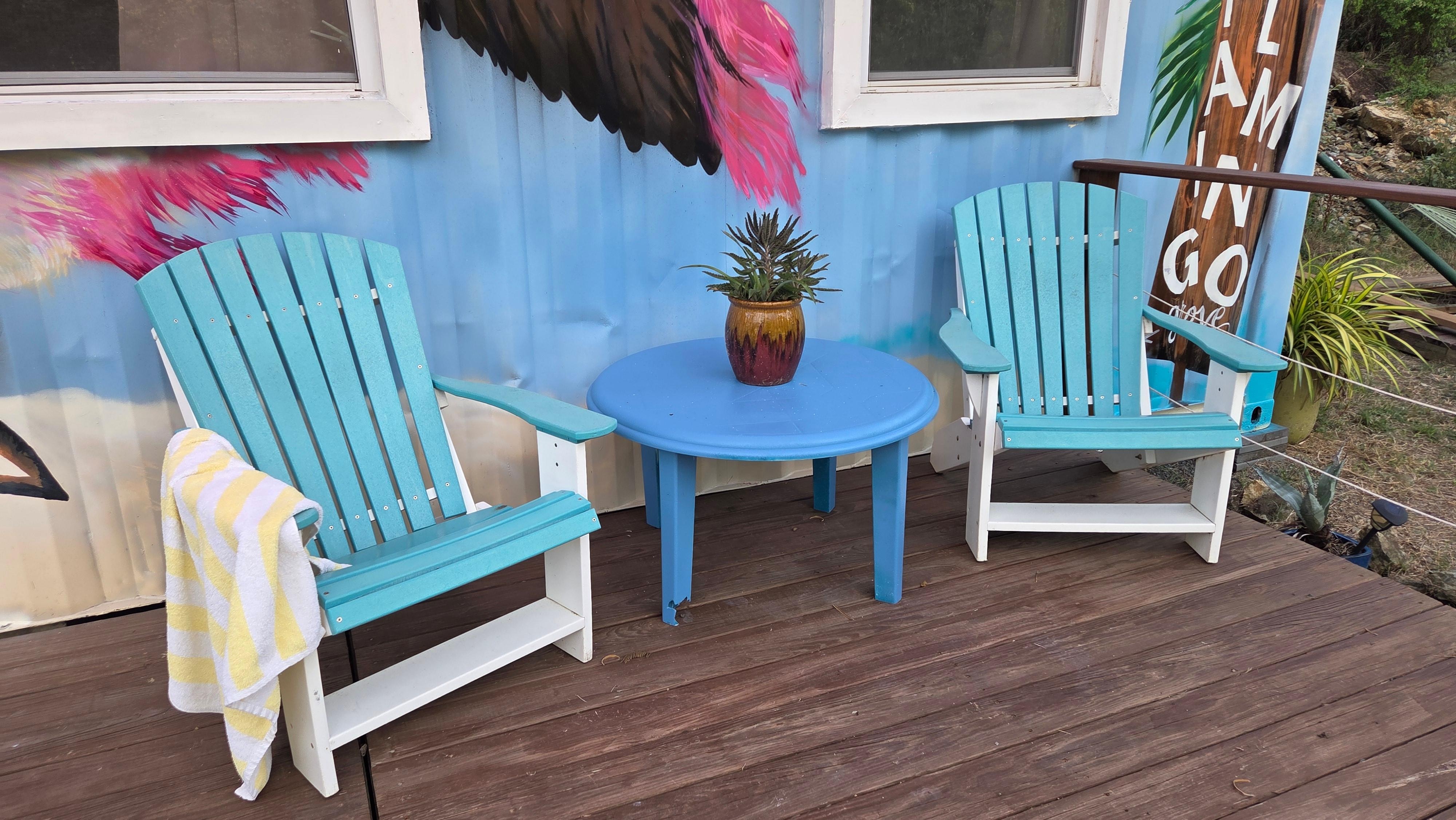 Our new and improved campsites have been upgraded to air conditioned container rooms! A queen matress with fresh linens and towels are ready for your stay. A TV, recessed lighting, air conditioning and small fan are also newly added to our sites. We have installed large decks with railings in front of each container room which also have two adirondack chairs and table. The conainer rooms are a new upgrade, so all reviews prior to August 1st 2024 are from the previous nylon tents.