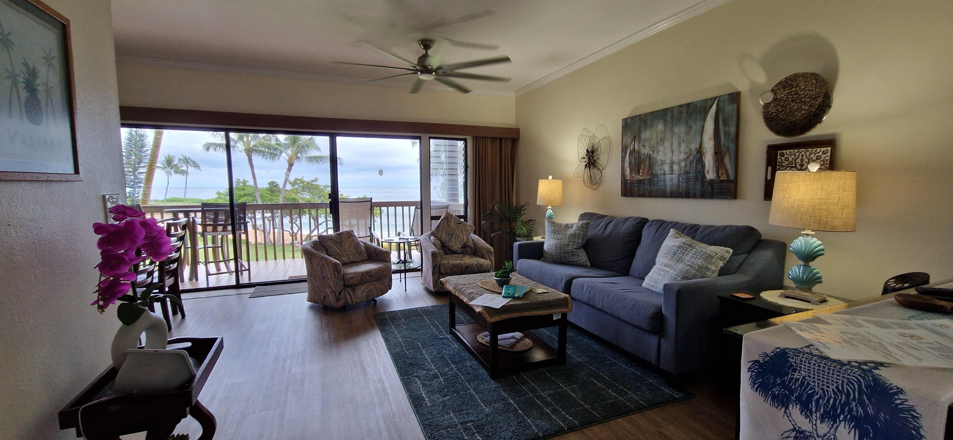 This oceanfront suite offers Complimentary high-speed Wi-Fi and Free Parking. The space is a generous 850 square fee, and the over-sized lanai is another 150 square feet There is a keyless entry system for convenient and safe check-in, and also strict disinfecting & cleaning measures in place. As mentioned above, Air Conditioning is in the bedroom only. This is a 2nd floor unit with no elevator, however parking is very convenient.