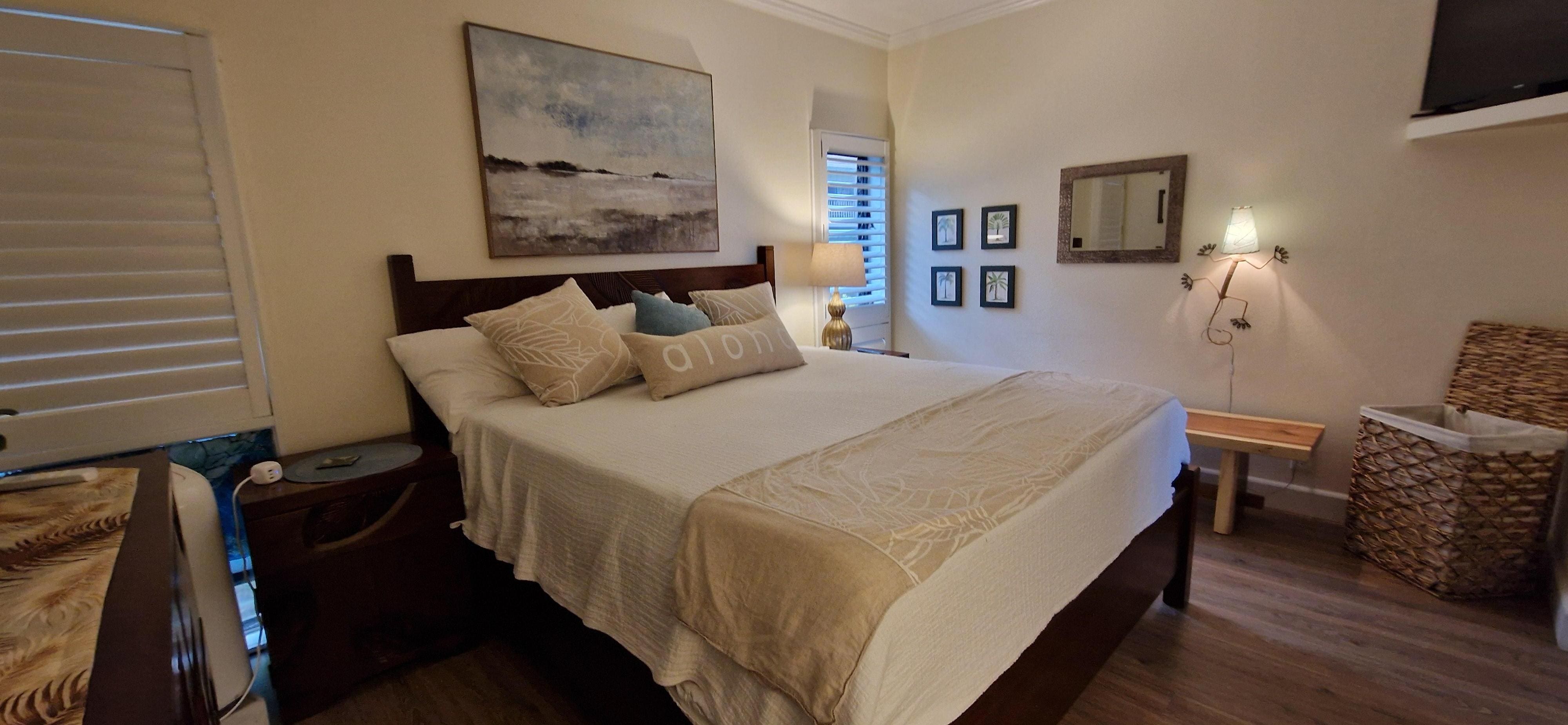 This remodeled retreat is so refreshing – you will not want to leave. The bedroom features a California king size bed, a new cool-sleep memory foam mattress, new luxurious linens and pillows, and air-conditioning for those warmer tropical nights (please note that a/c is located in the bedroom only). We also provide robes for you both - perfect for those crisper mornings on the lanai. The newly renovated bathrooms are stocked with all of the necessities needed for a worry-free stay, including towels and toilet paper, soap and shampoo, plus for those longer stays you'll have a washer and dryer in the complex with complimentary detergent at your fingertips.