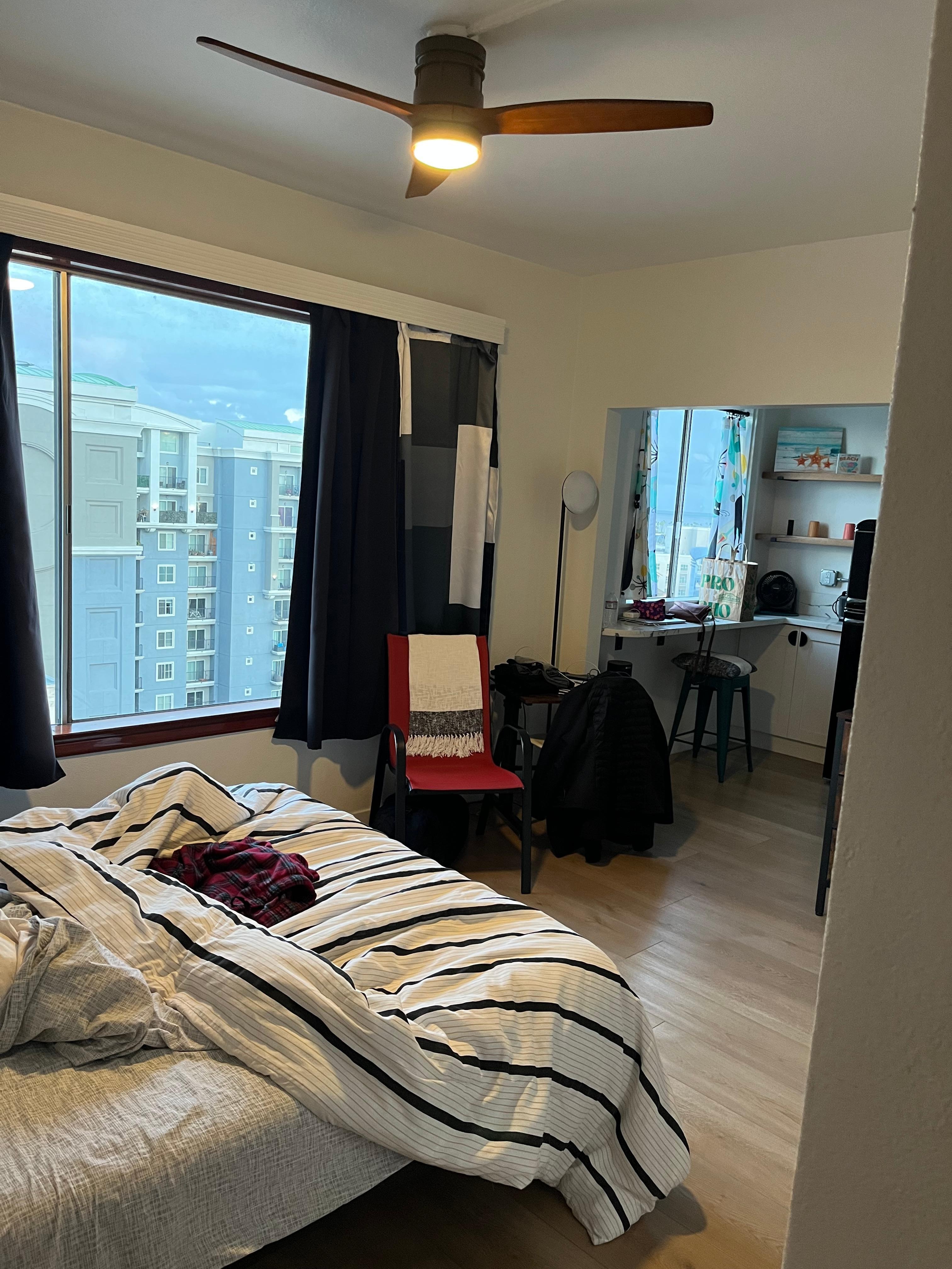 Great studio close to the convention center. I was worried about not having a/c, but I just opened the windows and the multiple fans were plenty to keep the studio cool. Room looks exactly as pictured. Great view of the queen mary from the roof.