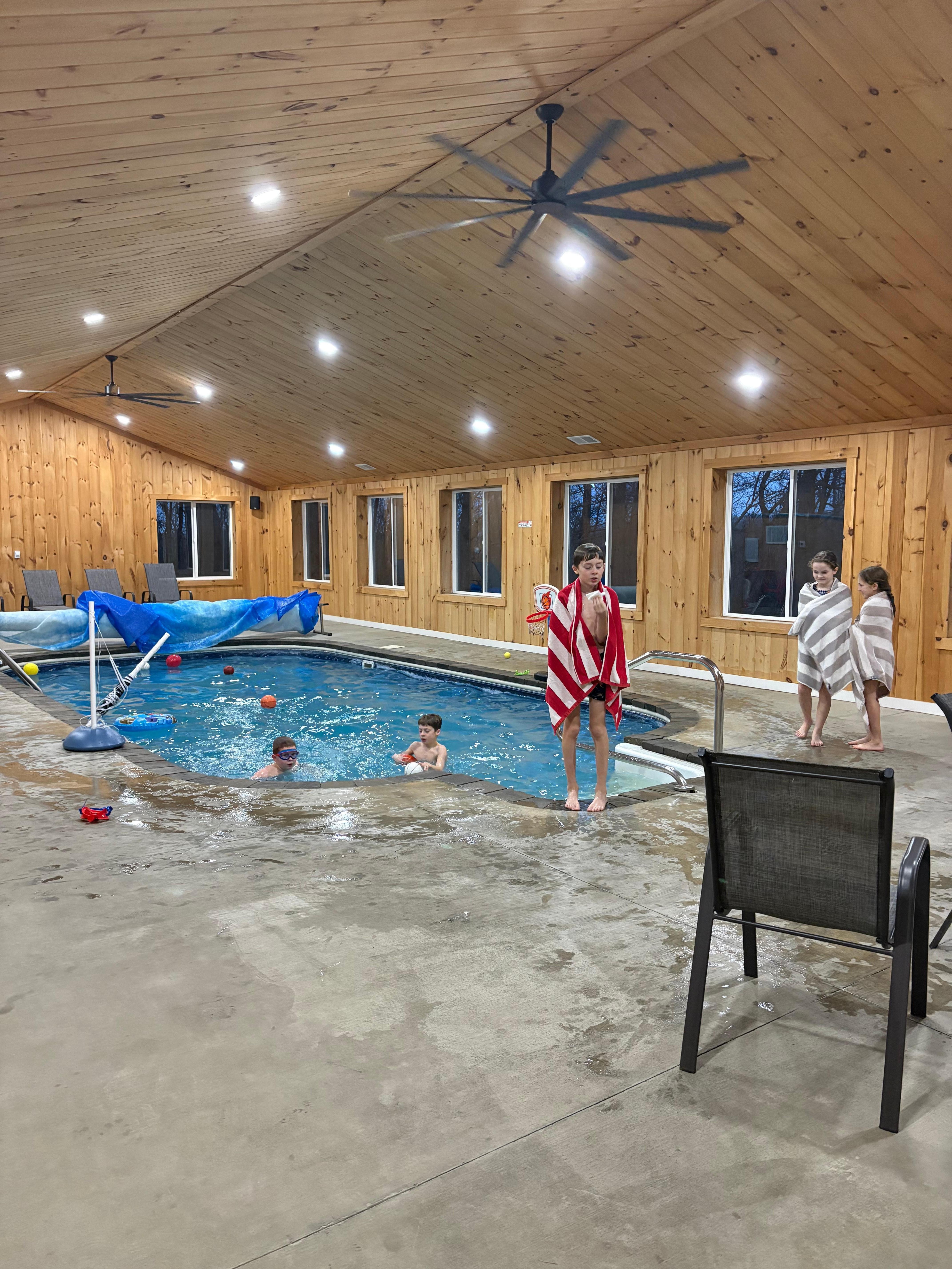 In the pool house you can enjoy swimming, sit pool side, and enjoy the 75" TV and Bluetooth speakers. Walk out the back sliding door onto our deck with tables and chairs for all and a propane grill. Down the path you will find our outdoor fire pit and 6 person hot tub.