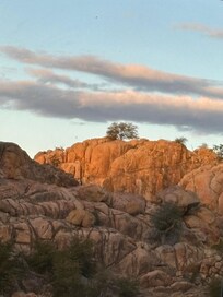 Situated in the boulders of Prescott Arizona's beautiful Granite Dells area. This cozy cottage is ready for your romantic getaway, honeymoon, or for a couple who are looking for an affordable weekend or a monthly retreat. Do you like to write? This home would be the place to awaken those creative juices! The home sleeps 2 but a guest/child could sleep on the comfy couch or the blow up full mattress. The Cottage boasts a large 1 bedroom with a queen bed, a wonderful outdoor deck with a patio heater and outside furniture. Once you step out onto the deck, it will be hard to leave as you gaze out over majestic boulders and spot wildlife of all kinds. Located close to downtown but far enough away to feel secluded. Hiking trails and climbing nearby. This home is fully stocked and ready to go! Oh... did I mention the view? Check out the pictures! You will not be disappointed. Sleeps 5 / Couch and Blow up Mattress.