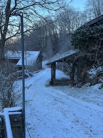 Se puede llegar a la propiedad en un cuarto de hora a pie o con un vehículo con tracción en las cuatro ruedas en una carretera de grava empinada (los conductores experimentados pueden hacerlo sin una tracción en las cuatro ruedas).