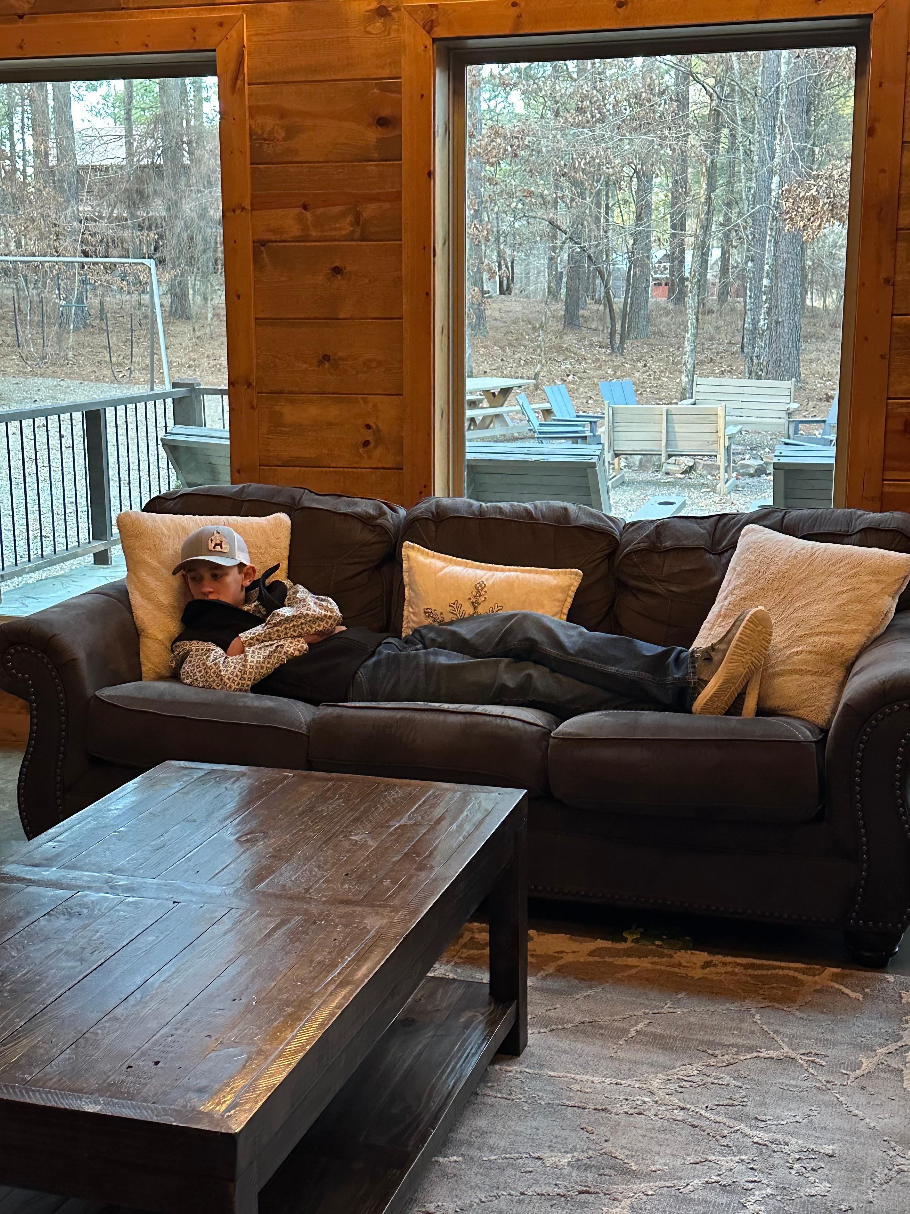 Playin' Hooky features 1.3 acres in a heavily-treed neighborhood with little traffic, so you can enjoy your time here without the noise. The cabin boasts a picturesque, three-story wall of windows in the family room, floor-to-ceiling windows in the open dining room and the master- bedroom. Mature gorgeous pine trees surround the cabin. Playin' Hooky has a fully equipped gourmet kitchen with an oversized island, granite countertops, and double ovens. The large open floor plan, offers plenty of room to enjoy cooking, dining and gathering with your friends and family.