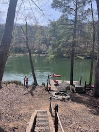 3 separate floors for each family to have some private time. No need to leave the cabin as everything is there for you to enjoy inside or out. Deer passing thru our property is a special treat. New stairs leading from the upper deck down to the new firepit area, as well as new stairs down to the lake. The lake is spring fed for swimming and why not do some fishing or exercise on kayaks. Later do some barbequing and enjoy family time by the fire.