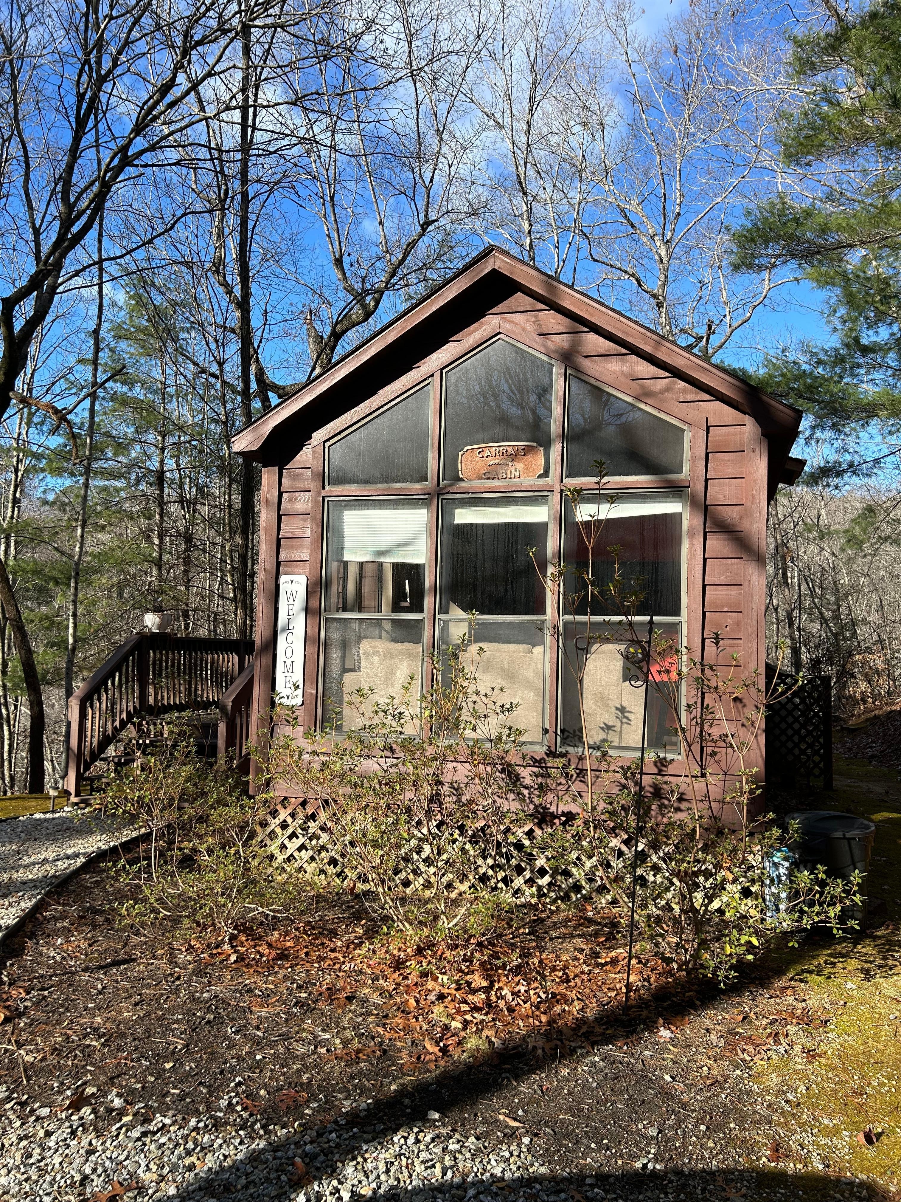 Carra’s Cabin is best suited for 2 adults, not suitable for children of any age. The driveway is steep at the bottom but levels off. Follow the driveway to the end for Carra’s Cabin. We have 2 other cabins on the property but each is secluded and private. The lockbox is located on the cabin near the hot tub and the key fits the french door.