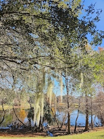 Our villa overlooks the central pond whose fountain is lit at night. Our screened balcony is the perfect spot to enjoy an early breakfast or a late-night book. We are literally a two minute walk along a lighted path to the main Club House with oversized pool, fitness center, hot tubs and children's splash pad. Two minutes across the parking lot from our villa will take you to the resort's barbecue area and children's playground.