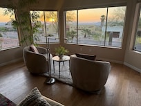 As you enter the house through the front door you will be welcomed into the living room. This area is a great room to gather for a movie night around the candled fireplace and large flat screen smart TV. The furniture is cozy & will accommodate a group of 3 to 4 people comfortably. Off to the left is a study room with two relaxing chairs and bookshelves complete with reading books. Off to the right of the living room sits two lounge chairs facing the open windows that show off the Sonoran mountains.